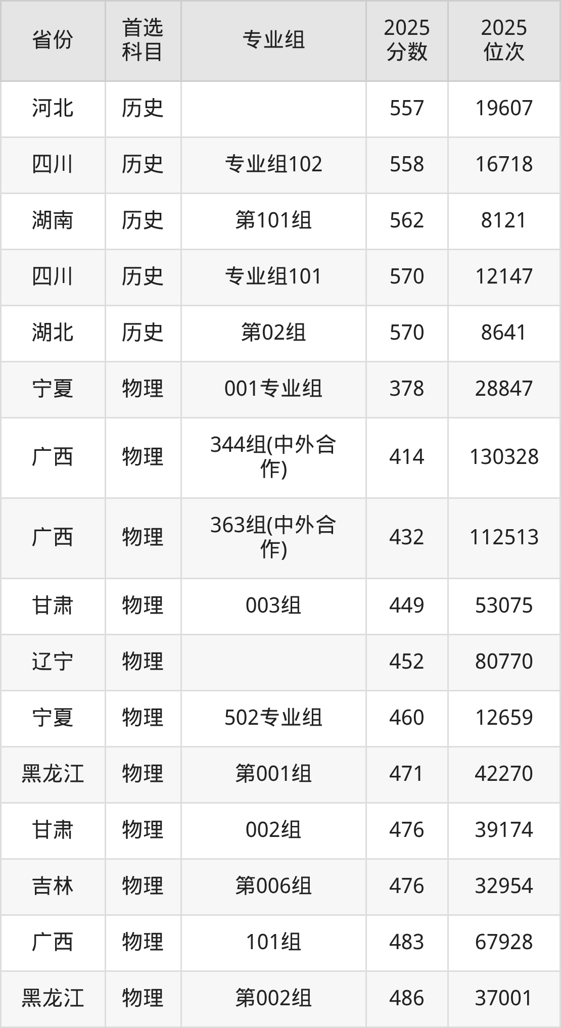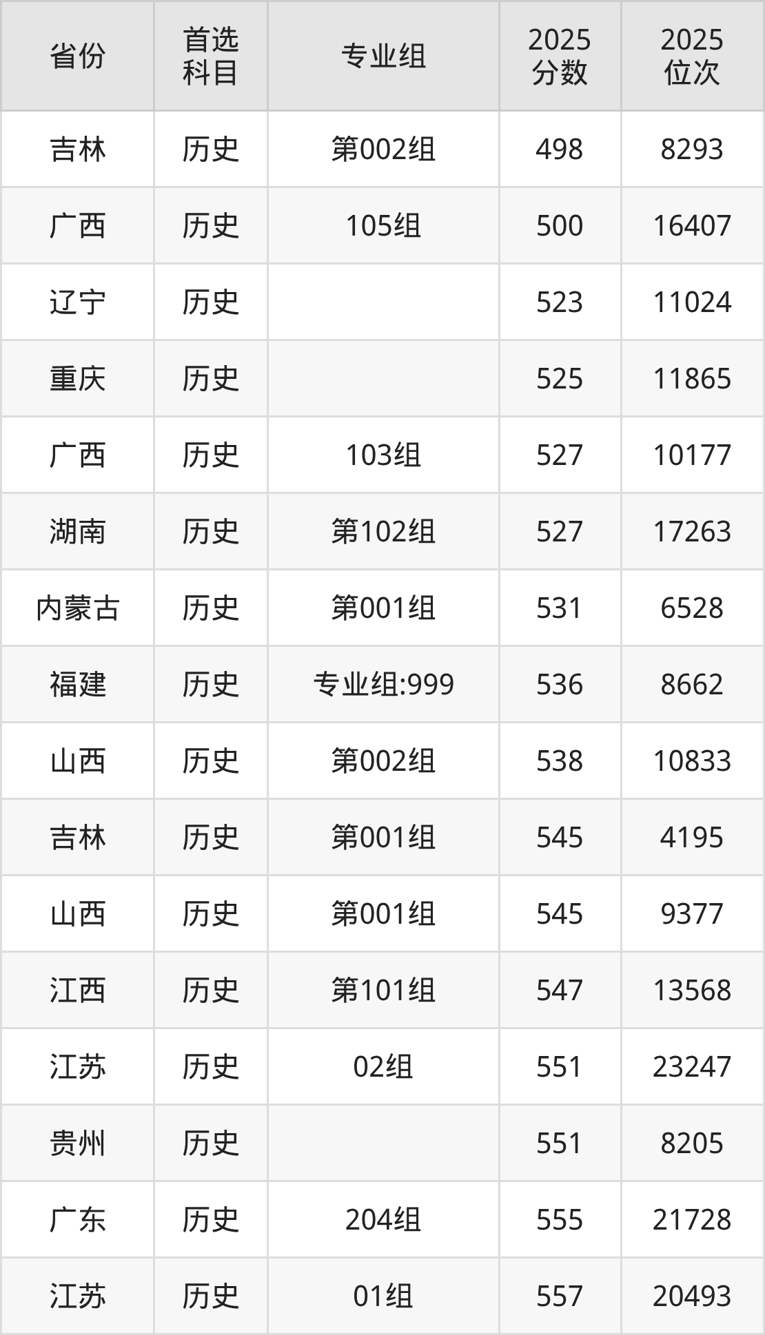 历史类最低分对应地区为吉林(第002组),录取位次为8293,超本科线114分;最高分对应地区为湖北(第02组),录取位次为8641,超本科线128分。