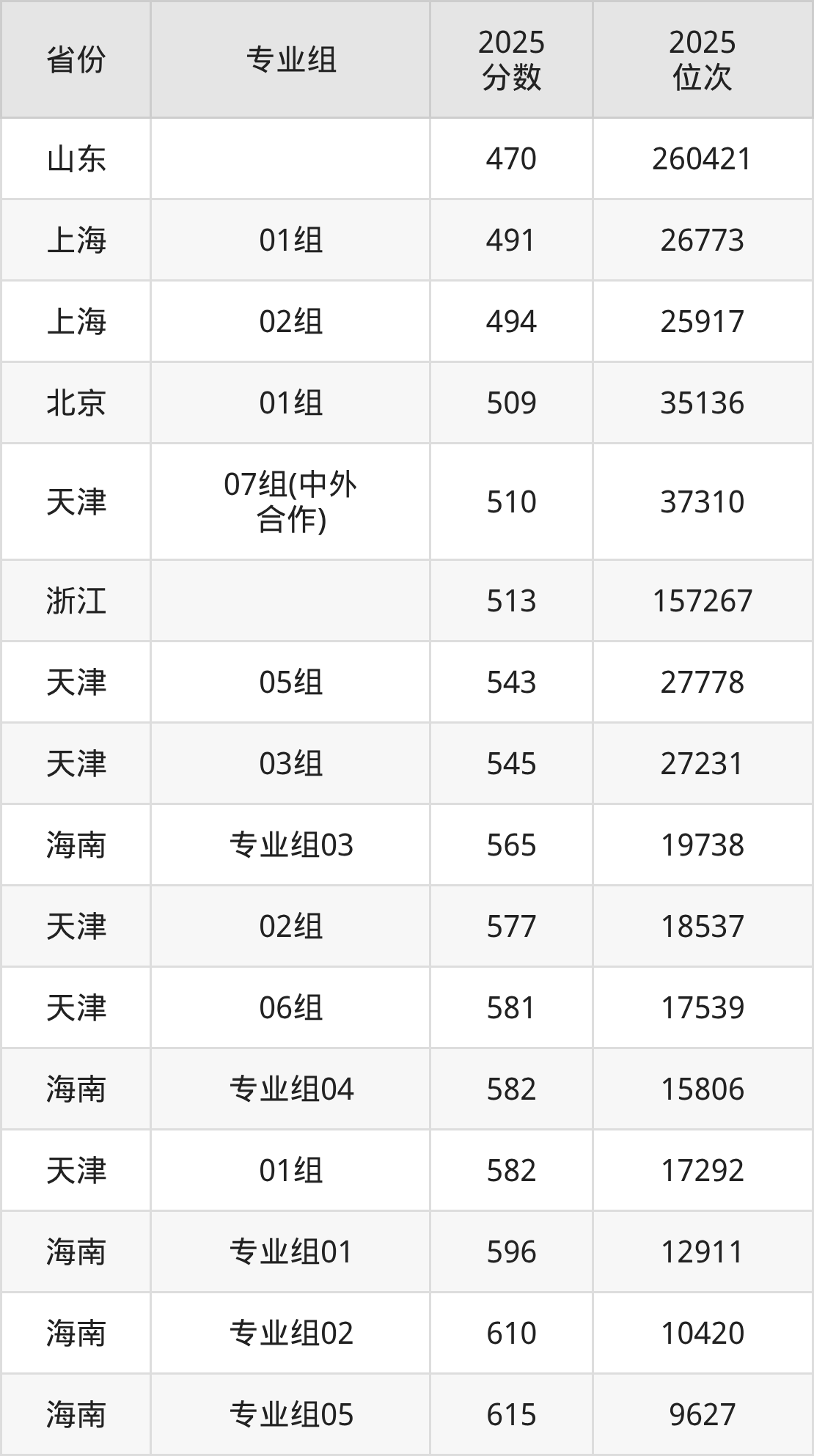 最低分对应地区为山东,录取位次为260421,超一段线29分;最高分对应地区为海南(专业组05),录取位次为9627,超本科线135分。