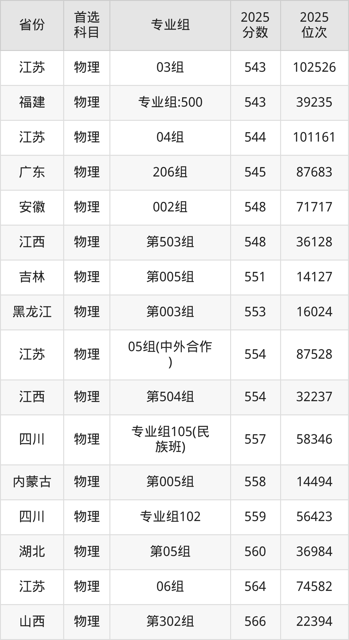 物理类:第003组508分、24393名,第004组522分、20946名,第005组546分、15749名,第006组464分、36267名;