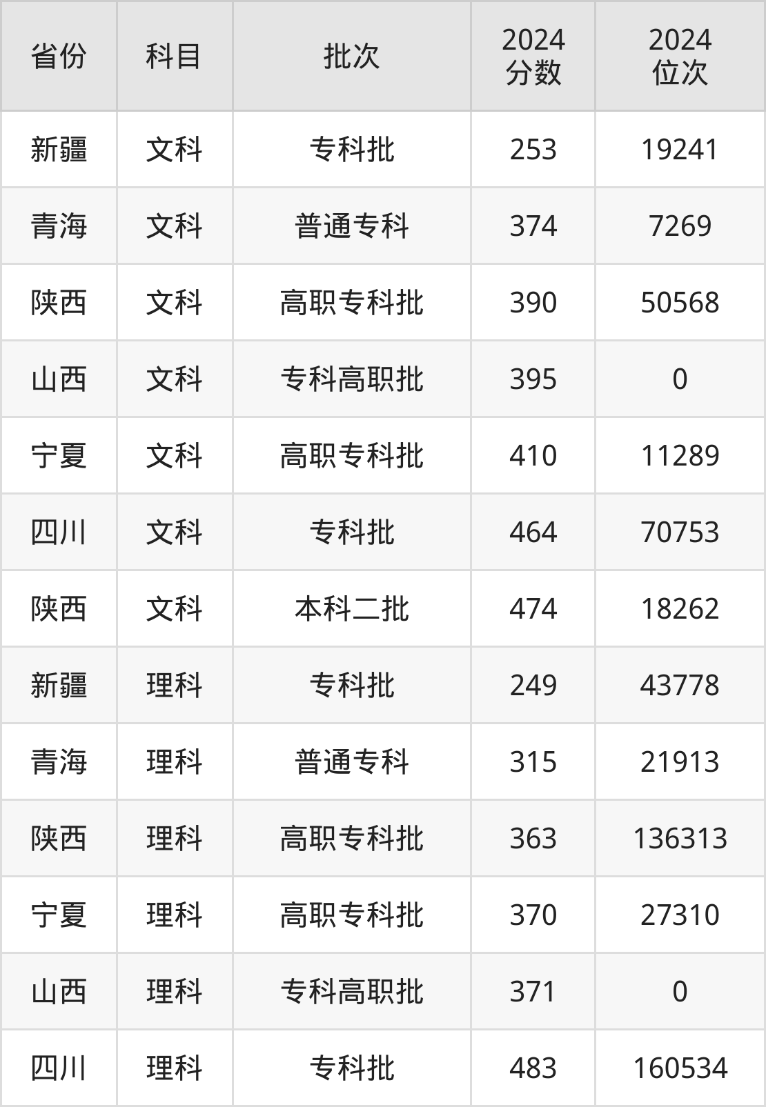 文科最低分对应地区为新疆,录取位次为19241,超专科线113分;最高分对应地区为陕西,录取位次为18262,超二本线77分。