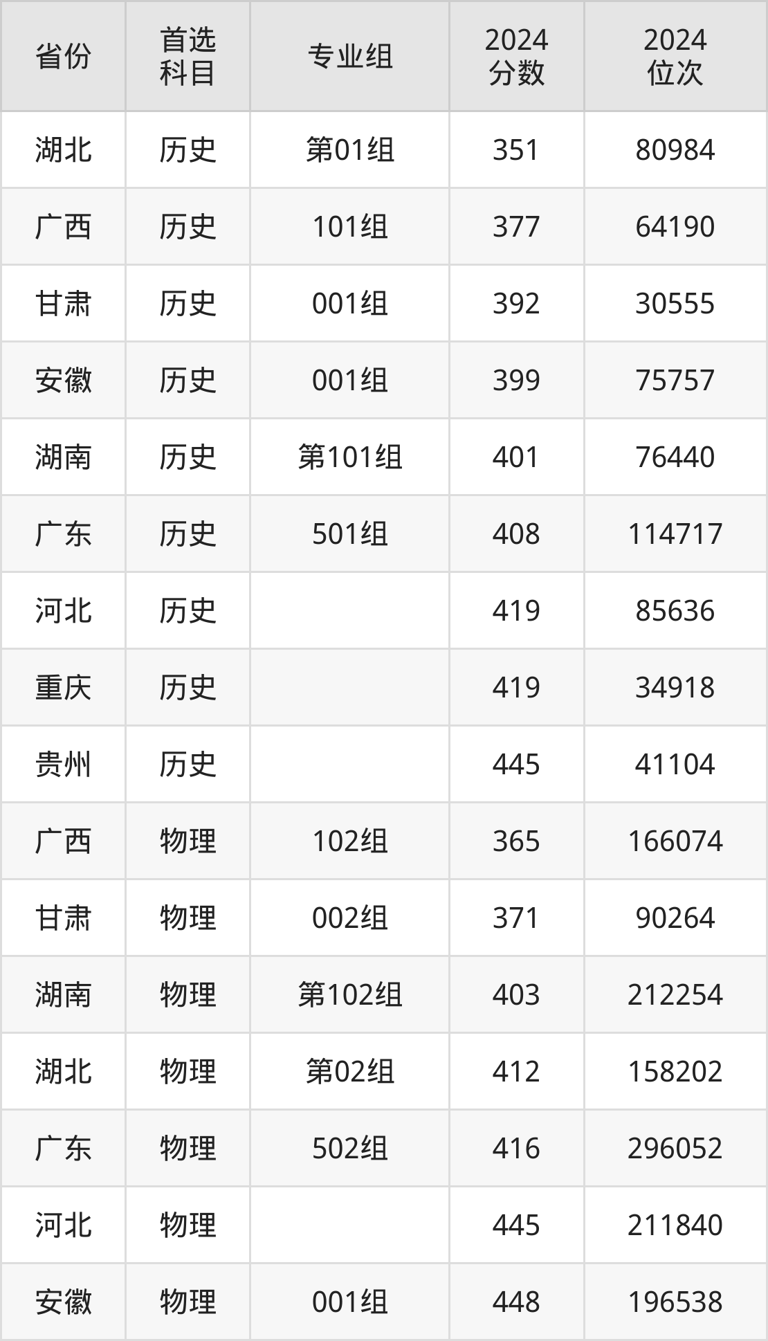 历史类最低分对应地区为湖北(第01组),录取位次为80984,超专科线151分;最高分对应地区为贵州,录取位次为41104,超专科线265分。