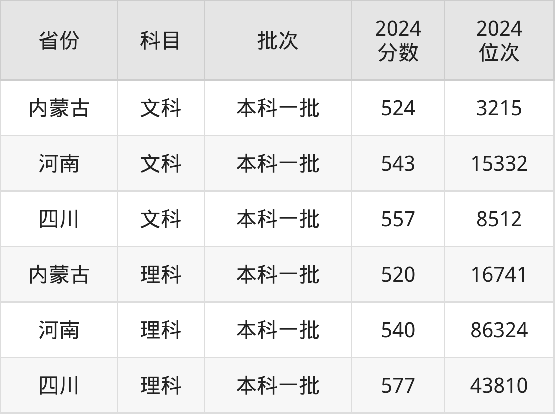 文科最低分对应地区为内蒙古,录取位次为3215,超46分;最高分对应地区为四川,录取位次为8512,超一本线28分。