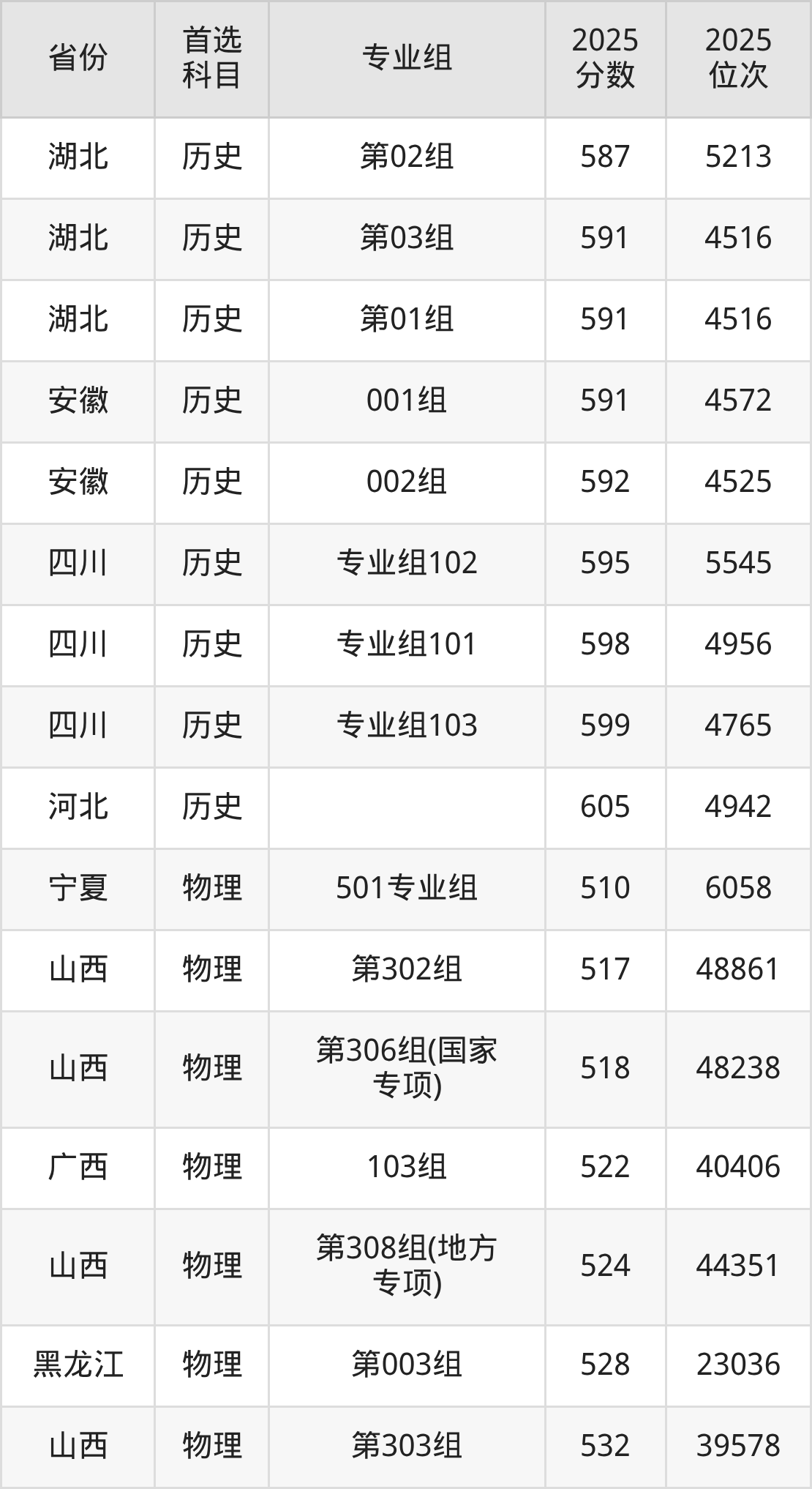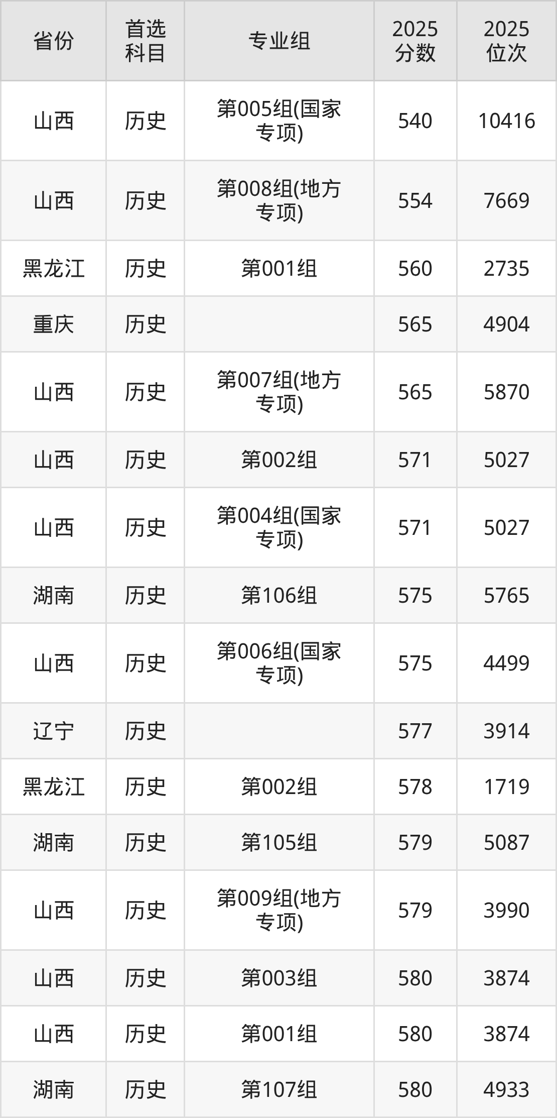 历史类:第001组580分、3874名,第002组571分、5027名,第003组580分、3874名,第004组(国家专项)571分、5027名,第005组(国家专项)540分、10416名,第006组(国家专项)575分、4499名,第007组(地方专项)565分、5870名,第008组(地方专项)554分、7669名,第009组(地方专项)579分、3990名;