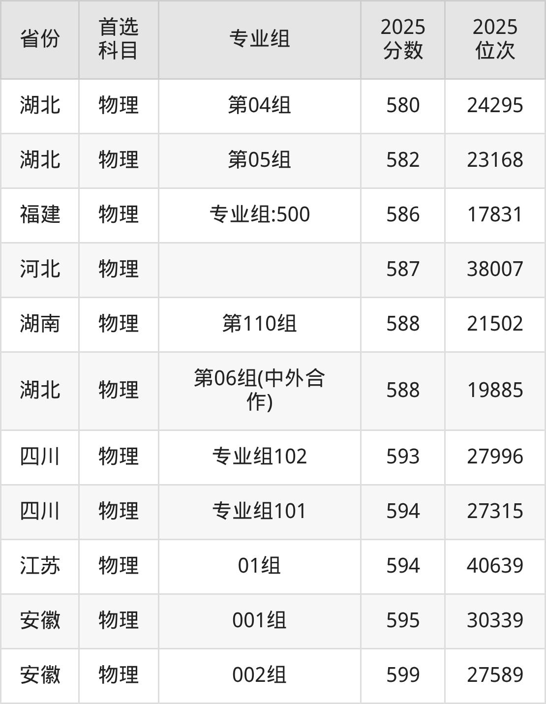物理类:第301组546分、31909名,第302组517分、48861名,第303组532分、39578名,第304组551分、29383名,第305组(合作办学)564分、23271名,第306组(国家专项)518分、48238名,第307组(国家专项)548分、30900名,第308组(地方专项)524分、44351名,第309组(地方专项)546分、31909名;