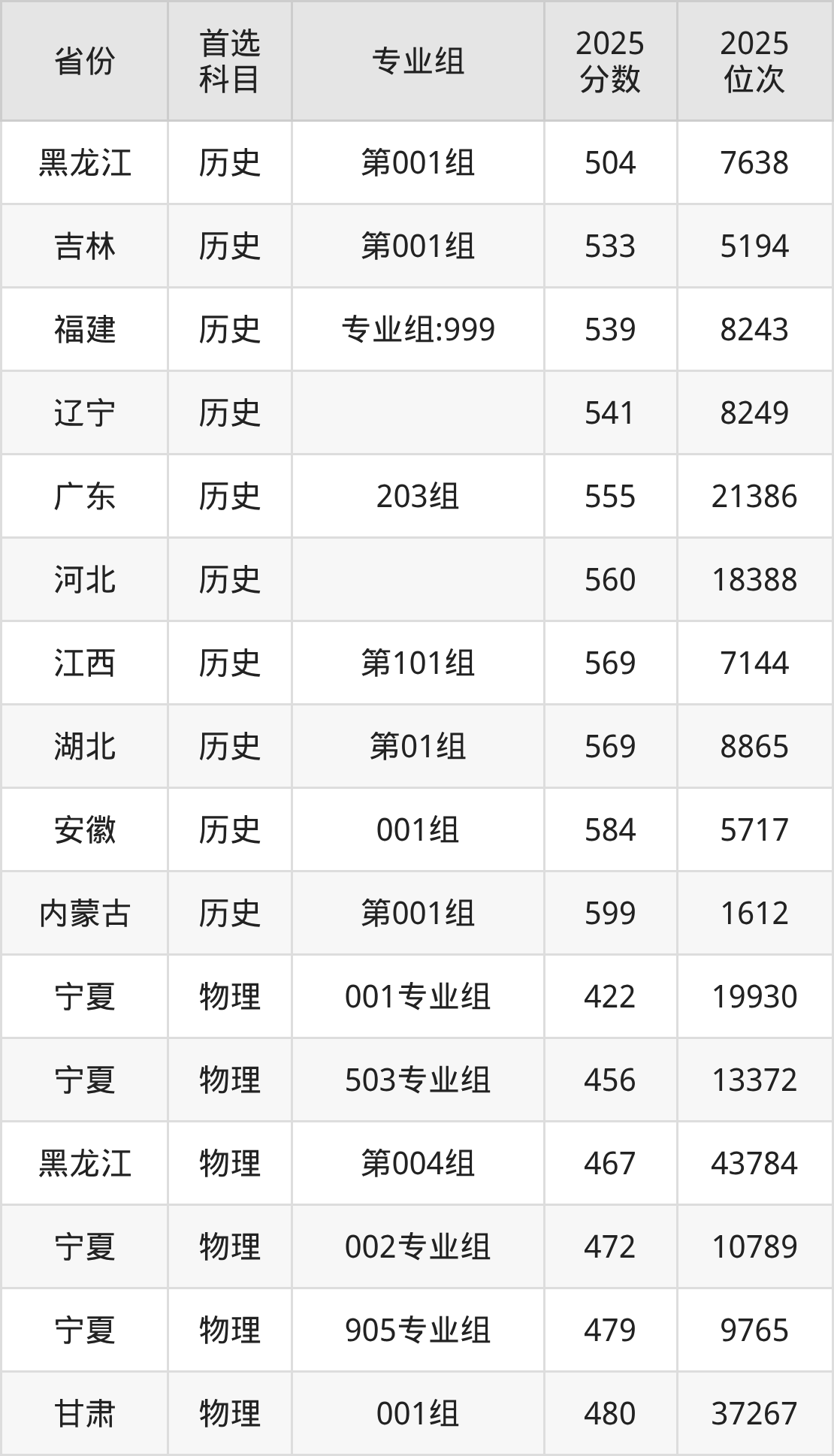 历史类最低分对应地区为黑龙江(第001组),录取位次为7638,超本科线99分;最高分对应地区为内蒙古(第001组),录取位次为1612,超本科线181分。