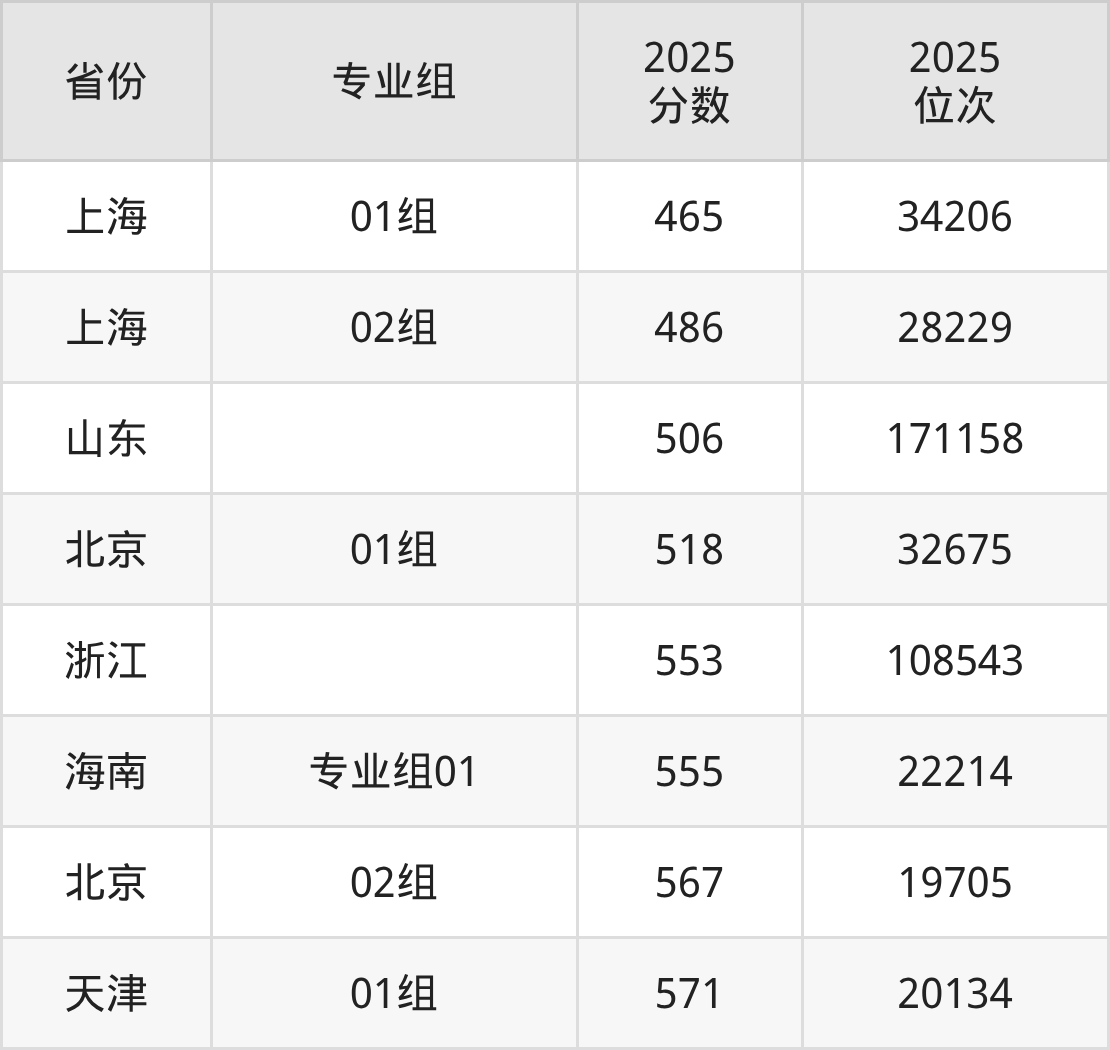 最低分对应地区为上海(01组),录取位次为34206,超本科线63分;最高分对应地区为天津(01组),录取位次为20134,超本科线95分。