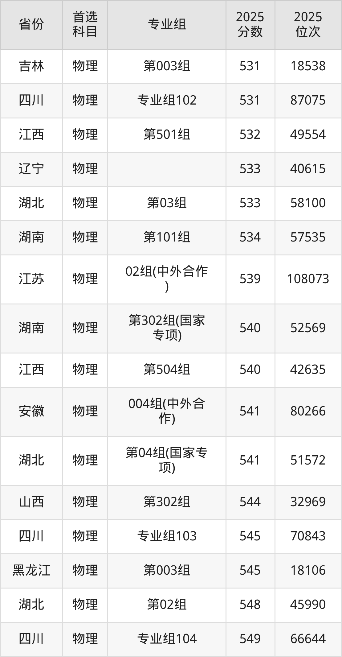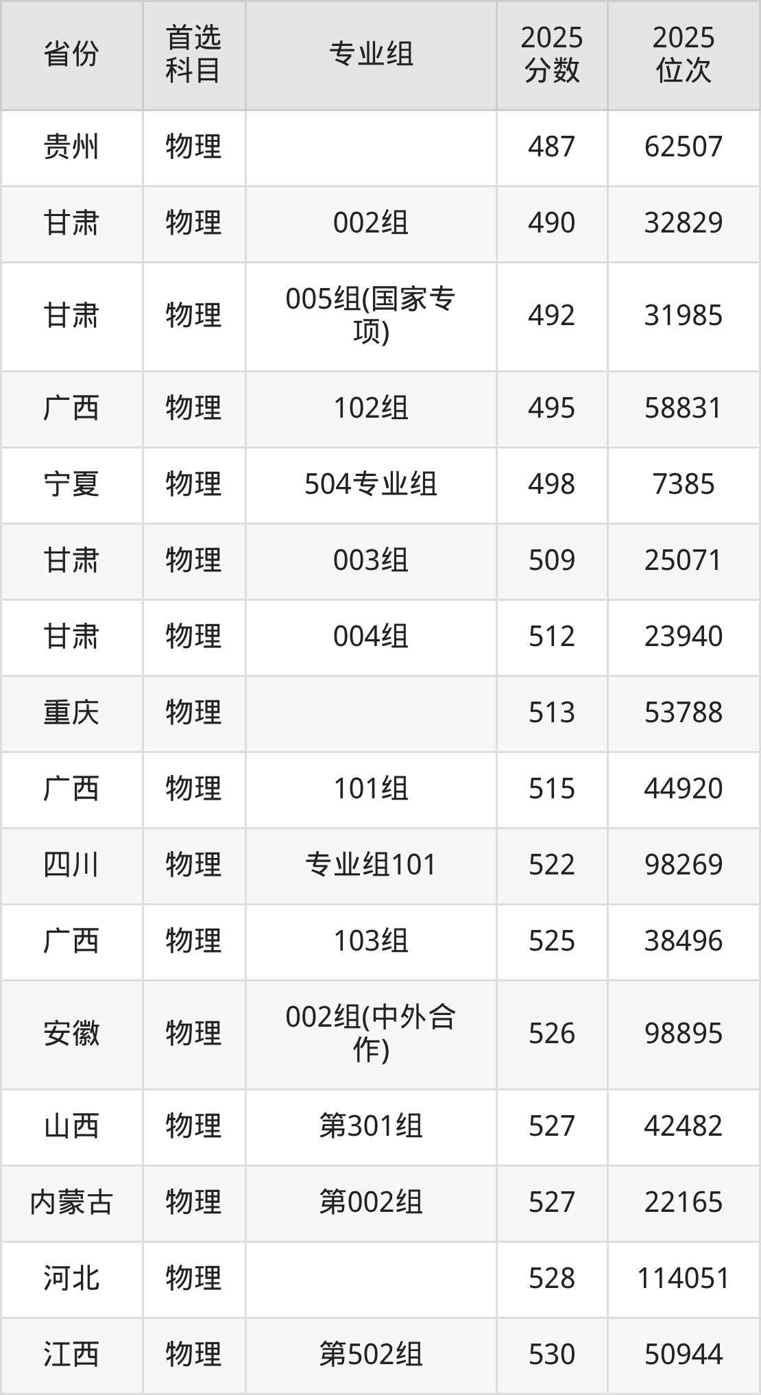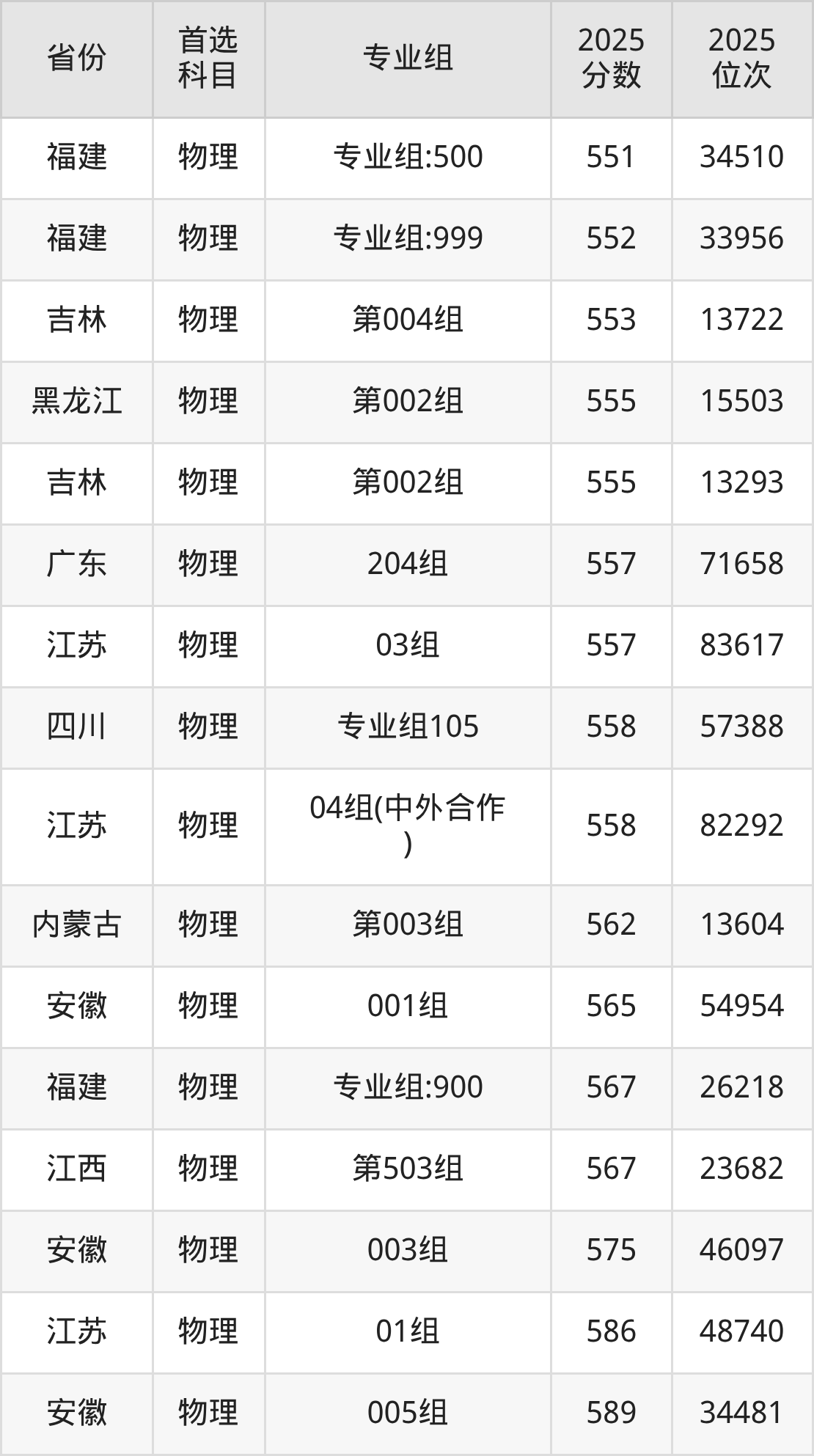 物理类最低分对应地区为宁夏(001专业组),录取位次为19930;最高分对应地区为江苏(05组),录取位次为44618,超本科线127分。