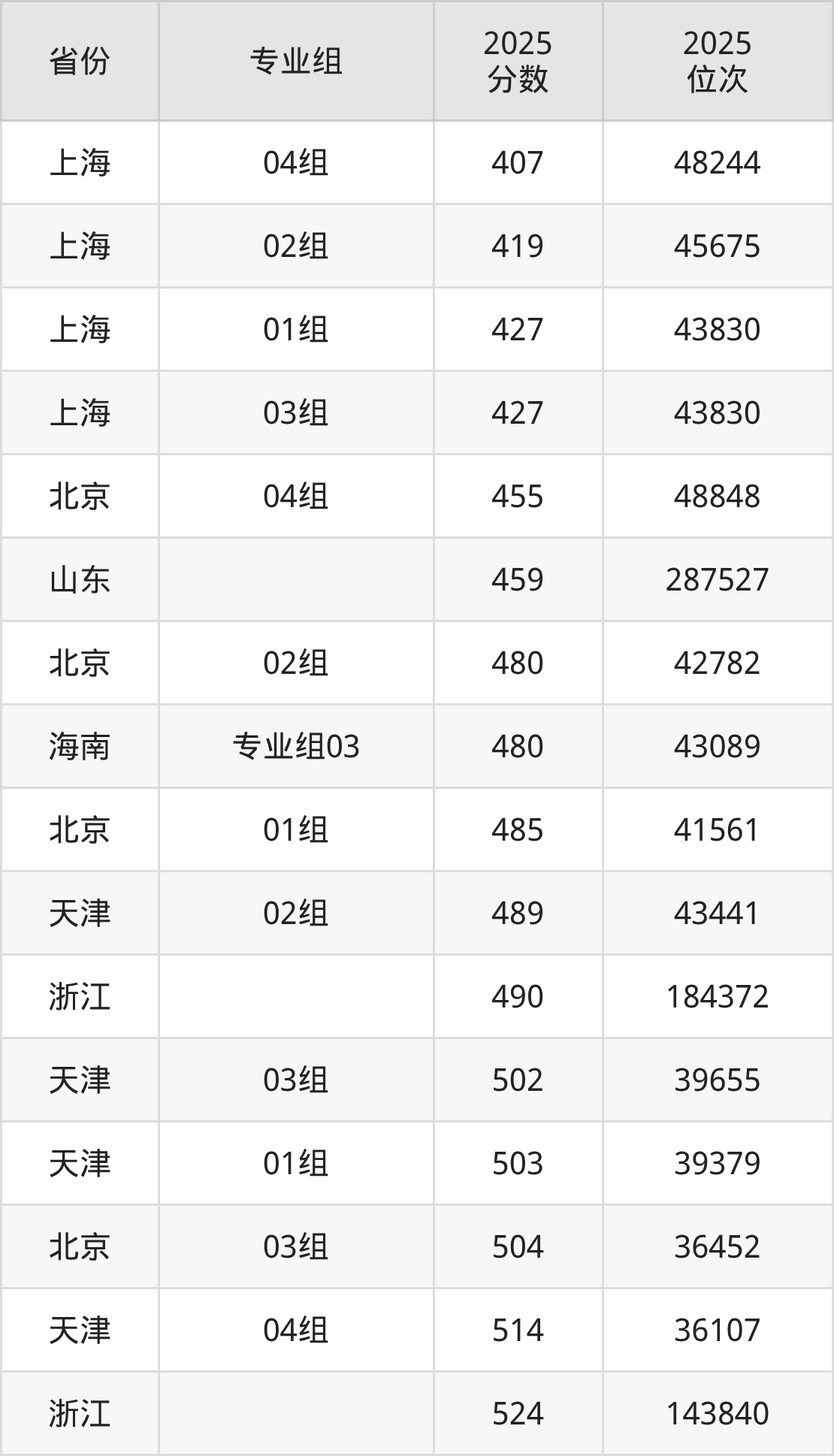 最低分对应地区为上海(04组),录取位次为48244,超本科线5分;最高分对应地区为海南(专业组01),录取位次为24344,超本科线67分。