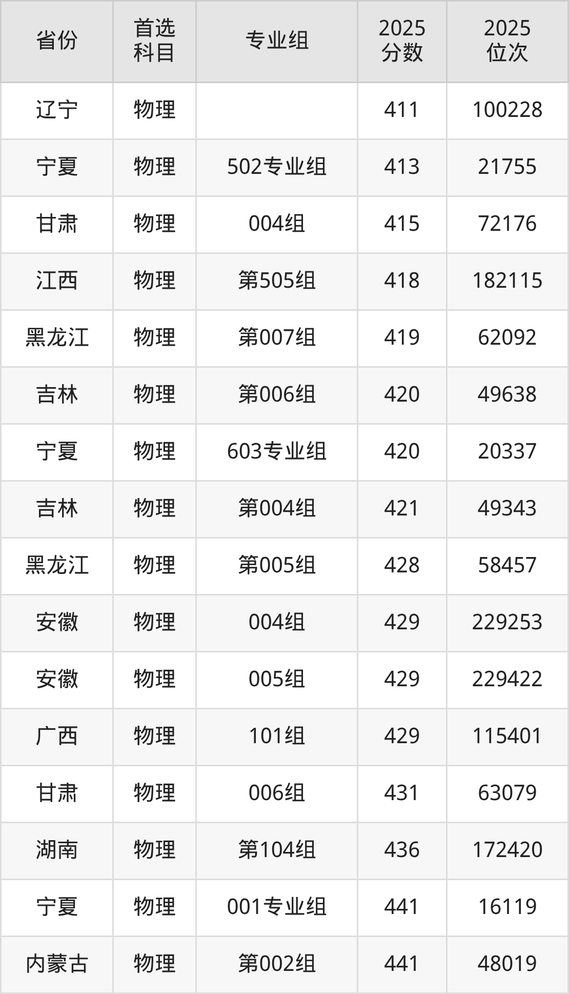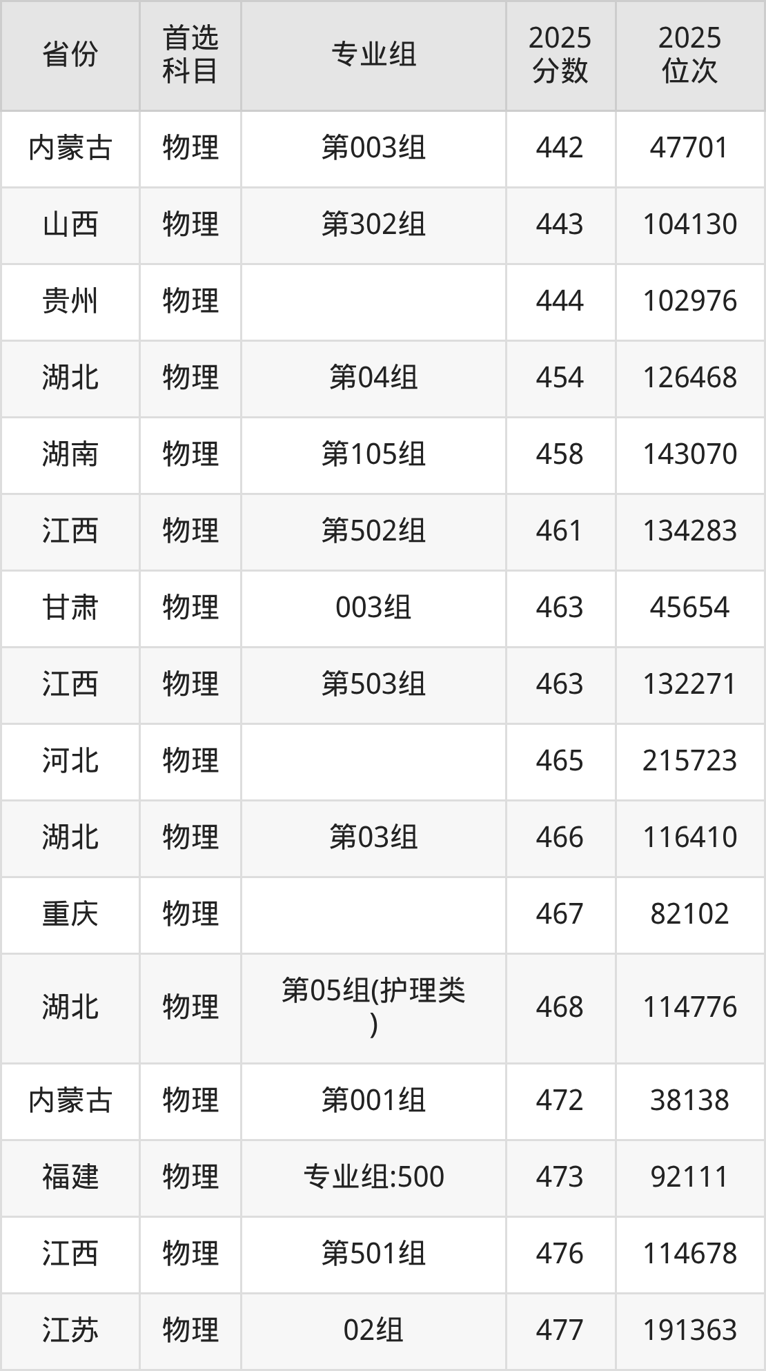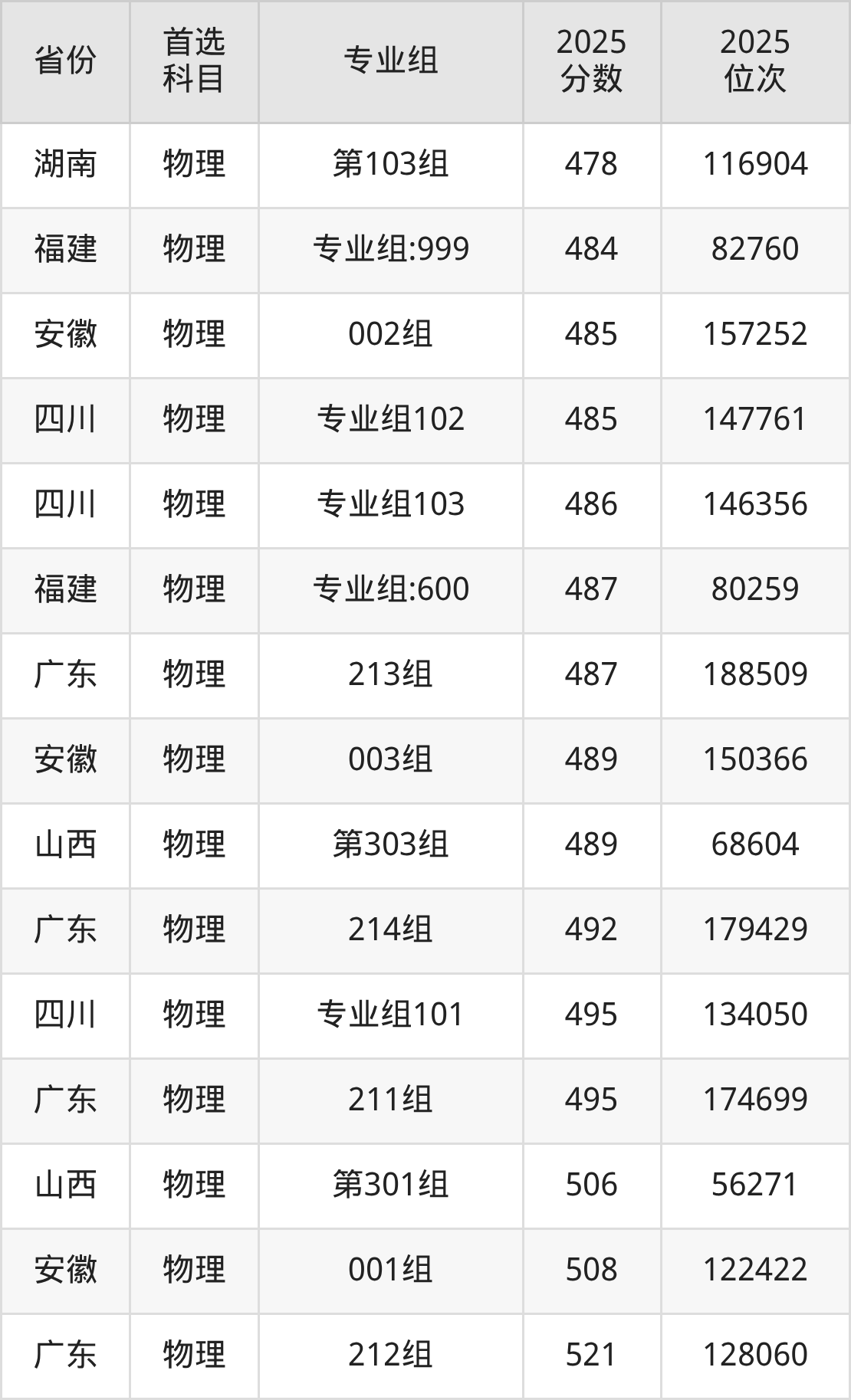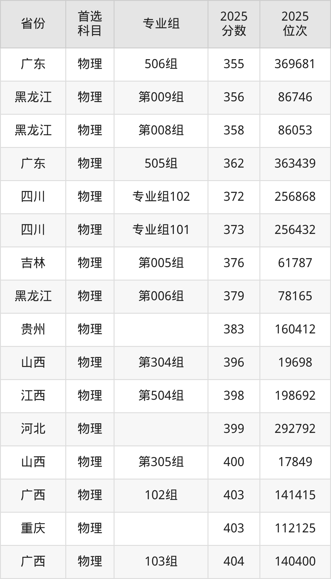 物理类:399分、292792名,465分、215723名;
