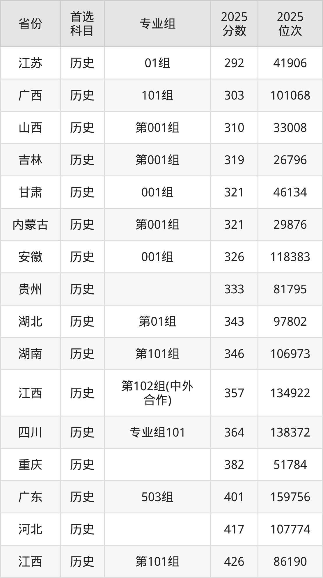 历史类:第101组426分、86190名,第102组(中外合作)357分、134922名;
