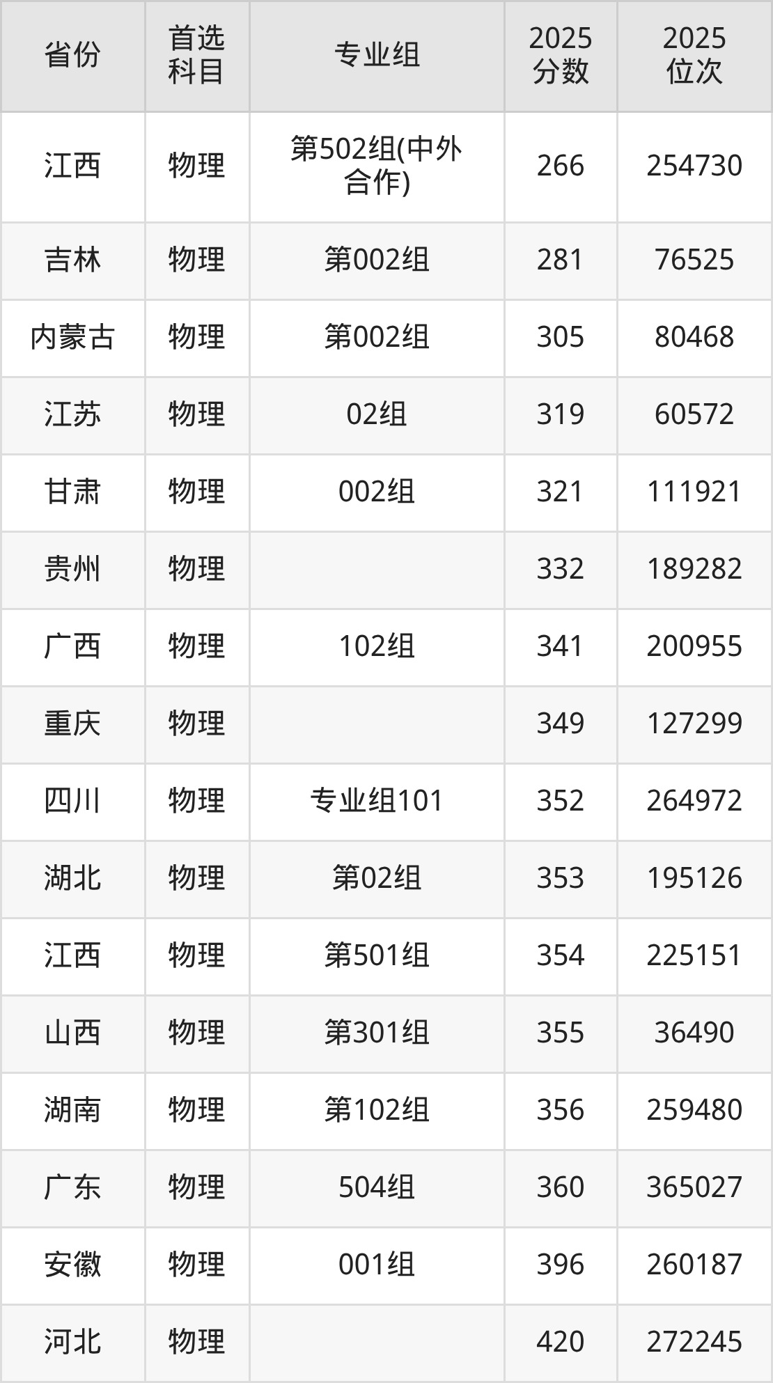 物理类:第501组354分、225151名,第502组(中外合作)266分、254730名;