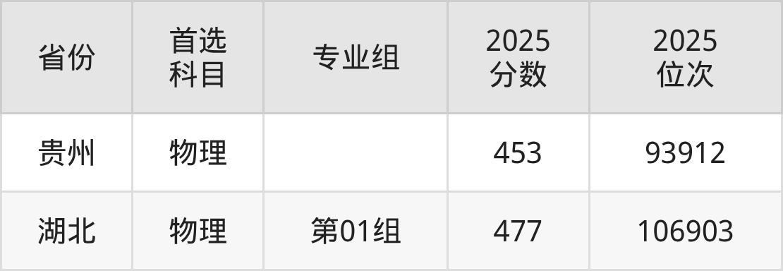 物理类最低分对应地区为贵州,录取位次为93912,超本科线66分;最高分对应地区为湖北(第01组),录取位次为106903,超本科线51分。