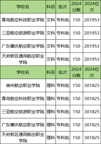 2024年四川航天航空大学最低分文科是150分、理科是150分。文科收分最低的航天航空大学有青岛航空科技职业学院、三亚航空旅游职业学院、广东肇庆航空职业学院等;理科收分最低的航天航空有宿州航空职业学院、青岛航空科技职业学院、三亚航空旅游职业学院等。完整名单如下表所示: