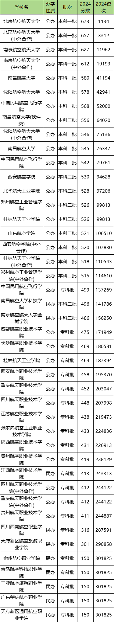 以四川理科为例,2024年全国航天航空大学录取分数线位于150分到673分之间,最难考的是北京航天航空大学,学校2024年最低是673分,录取最低位次1134名。