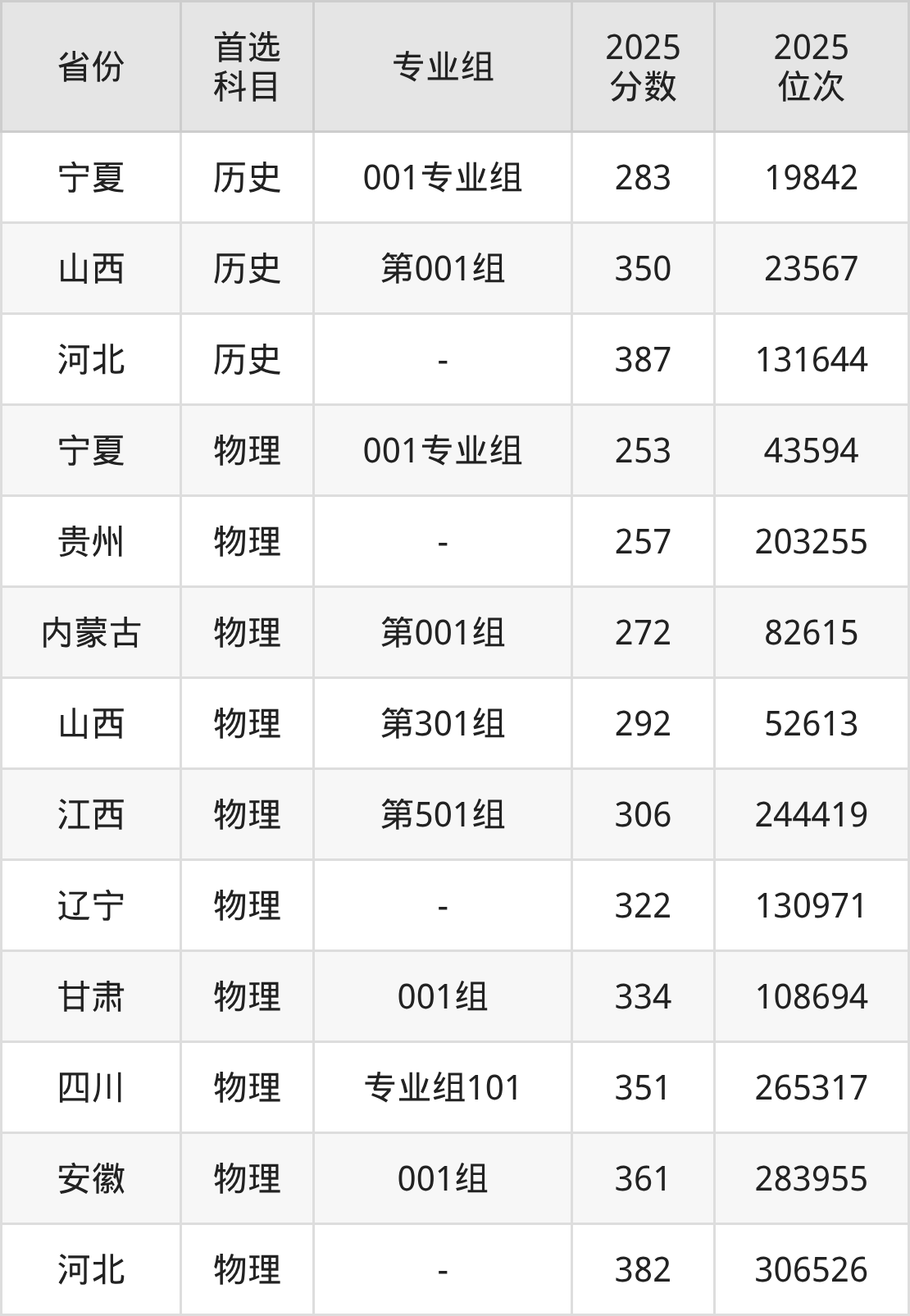 物理类最低分对应地区为宁夏(001专业组),录取位次为43594,超专科线103分;最高分对应地区为河北,录取位次为306526,超专科线182分。