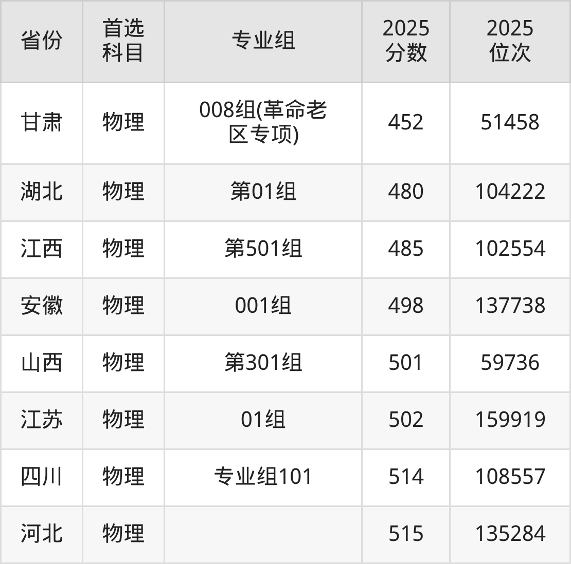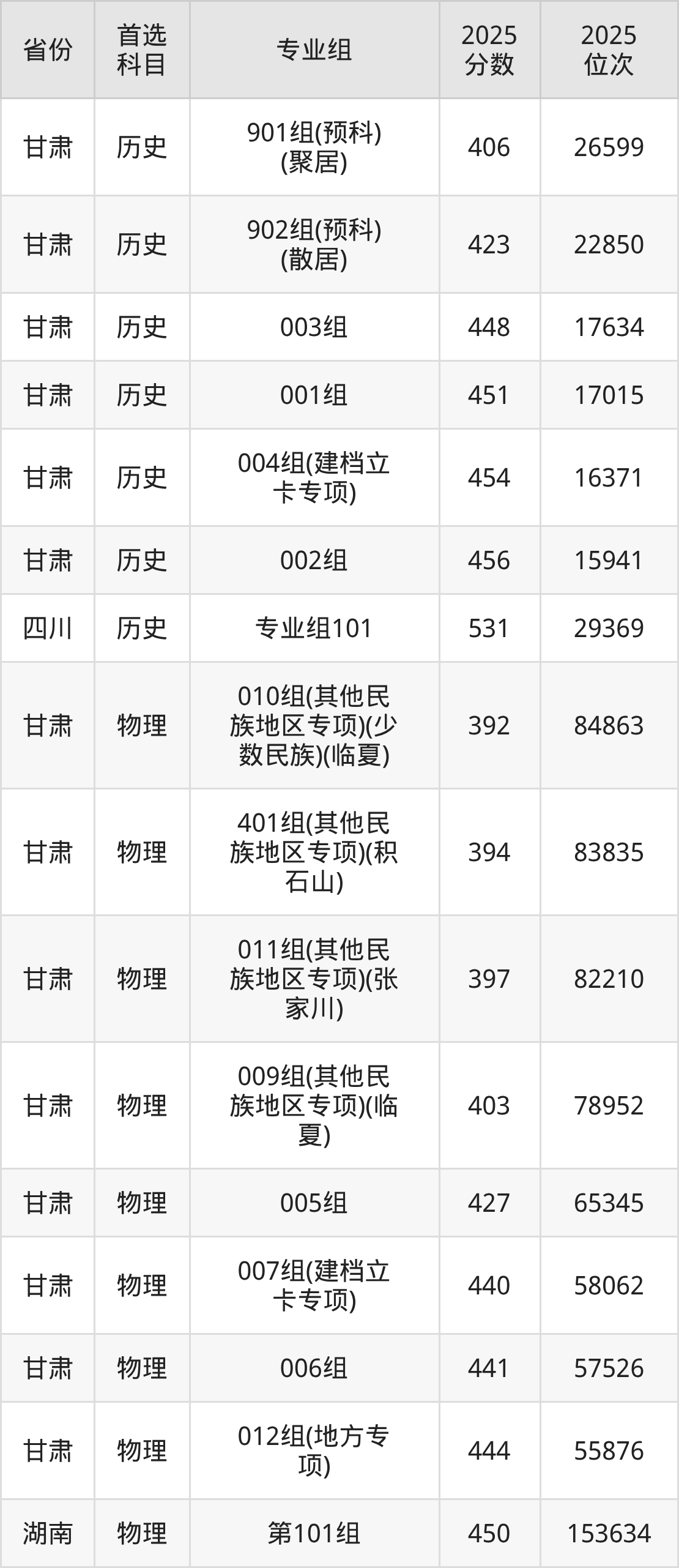 物理类:005组427分、65345名,006组441分、57526名,007组(建档立卡专项)440分、58062名,008组(革命老区专项)452分、51458名,009组(其他民族地区专项)(临夏)403分、78952名,010组(其他民族地区专项)(少数民族)(临夏)392分、84863名,011组(其他民族地区专项)(张家川)397分、82210名,012组(地方专项)444分、55876名,401组(其他民族地区专项)(积石山)394分、83835名;