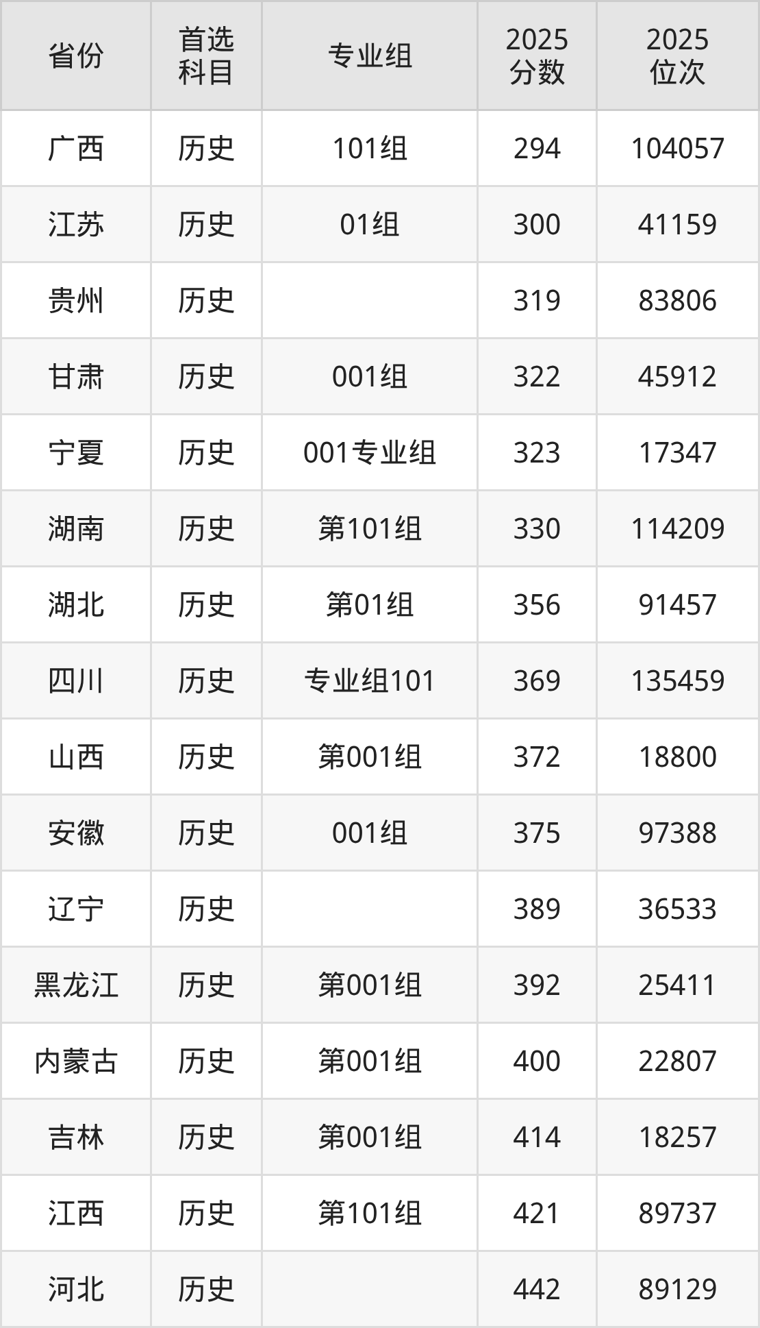 历史类最低分对应地区为广西(101组),录取位次为104057,超专科线94分;最高分对应地区为河北,录取位次为89129,超专科线242分。