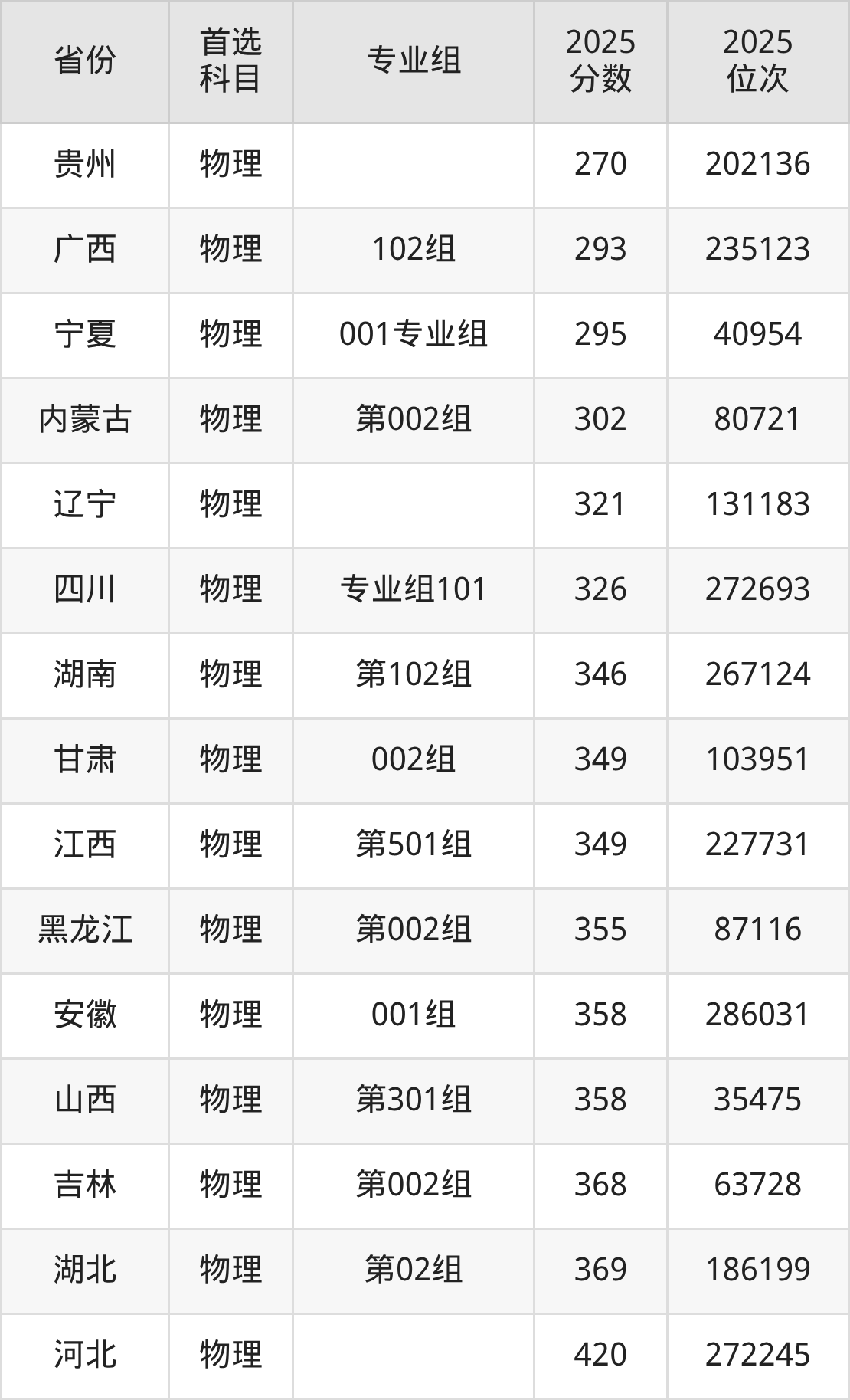 物理类最低分对应地区为贵州,录取位次为202136;最高分对应地区为河北,录取位次为272245。
