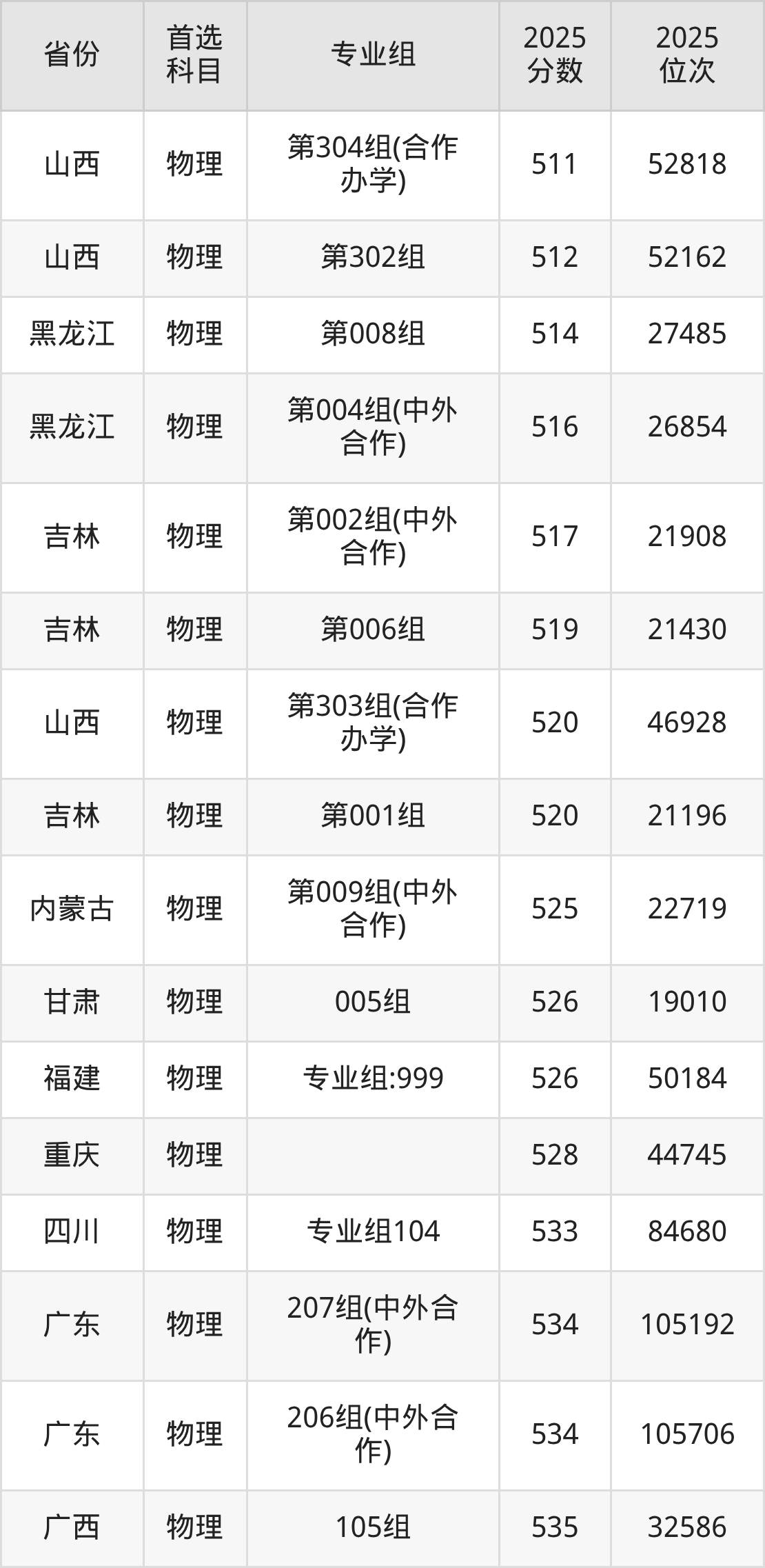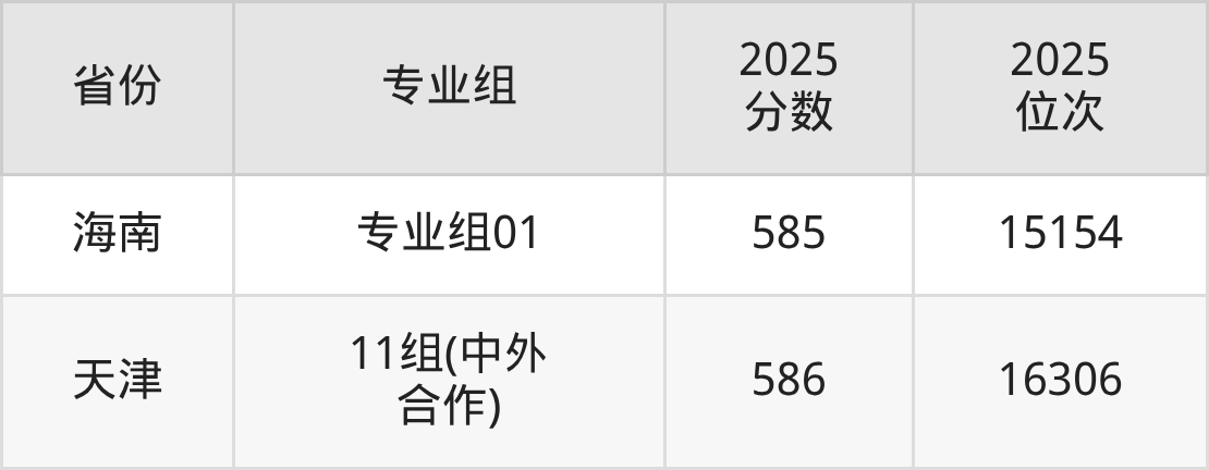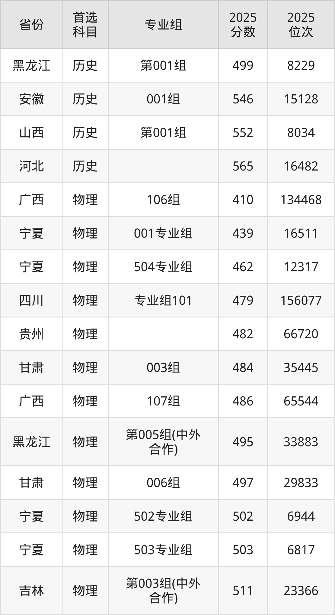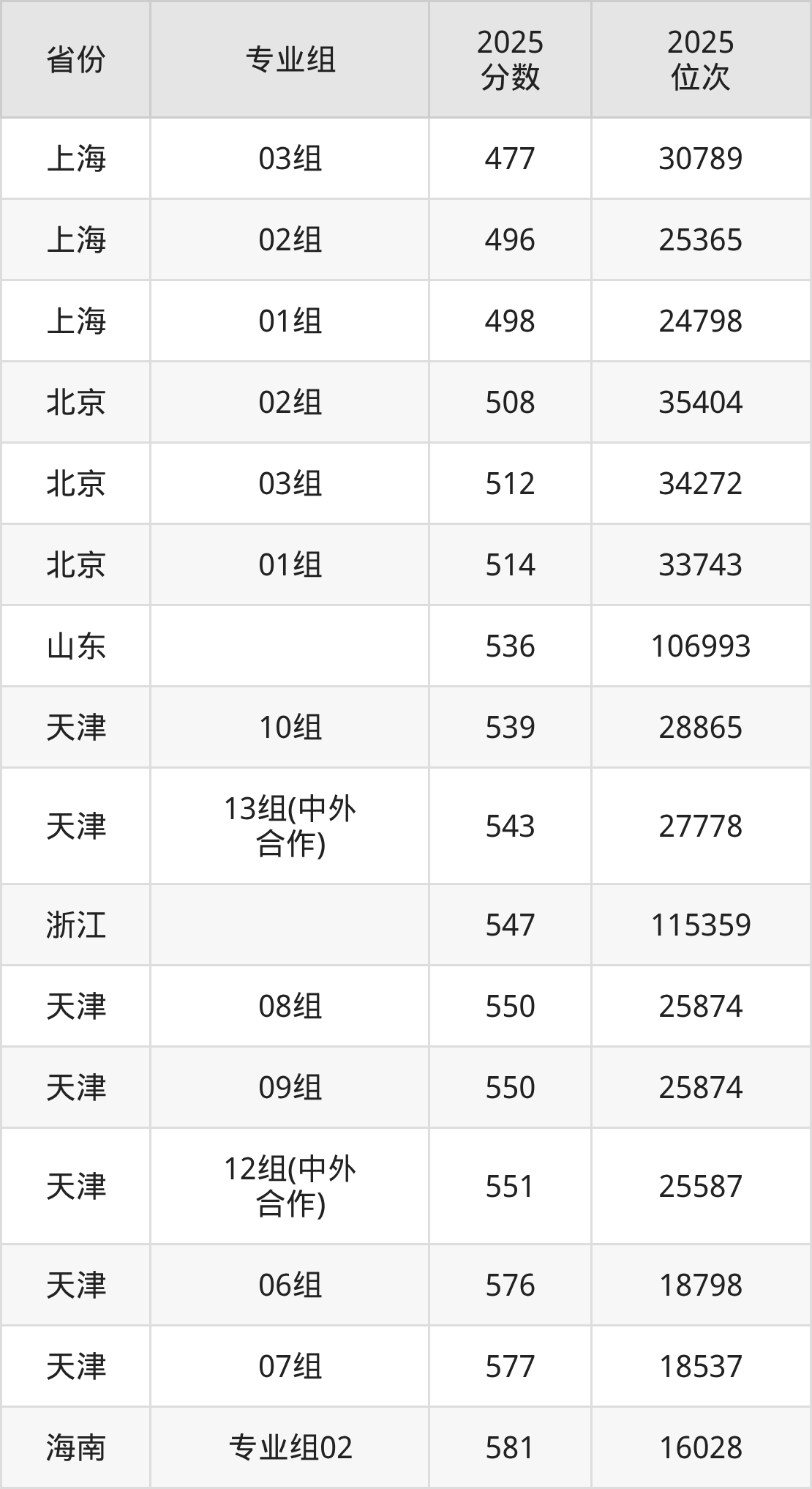 06组576分、18798名,07组577分、18537名,08组550分、25874名,09组550分、25874名,10组539分、28865名,11组(中外合作)586分、16306名,12组(中外合作)551分、25587名,13组(中外合作)543分、27778名;