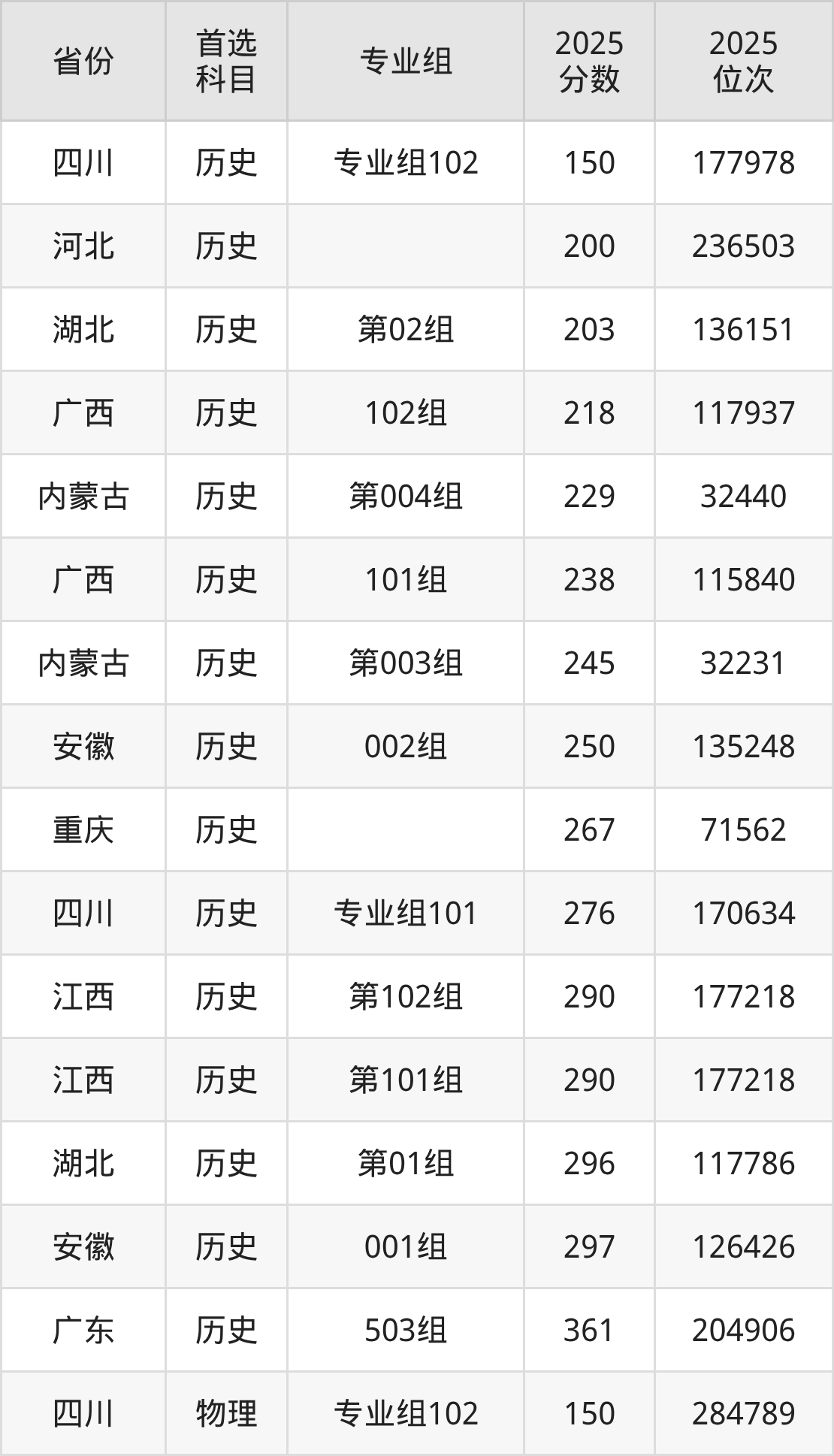 历史类最低分对应地区为四川(专业组102),录取位次为177978;最高分对应地区为广东(503组),录取位次为204906,超专科线146分。