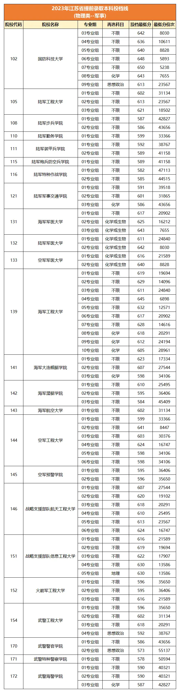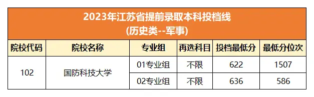 2023年在江苏历史科目组招生的军校只有国防科技大学一所,两个专业组中录取分数线最低为622分。