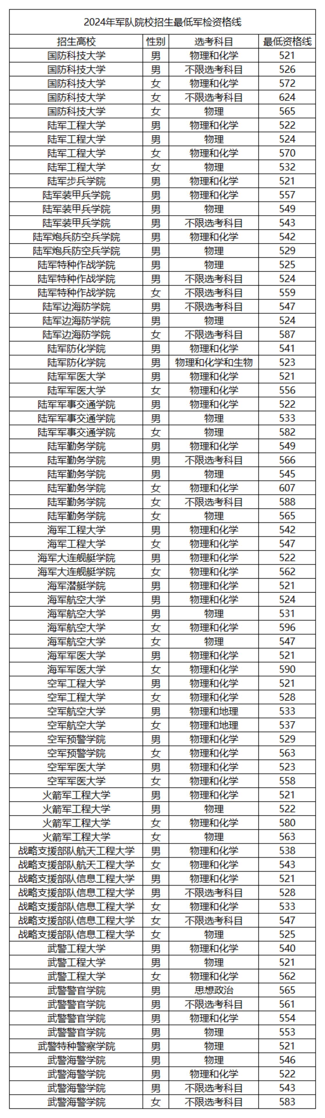一、2024年军校最低录取分数