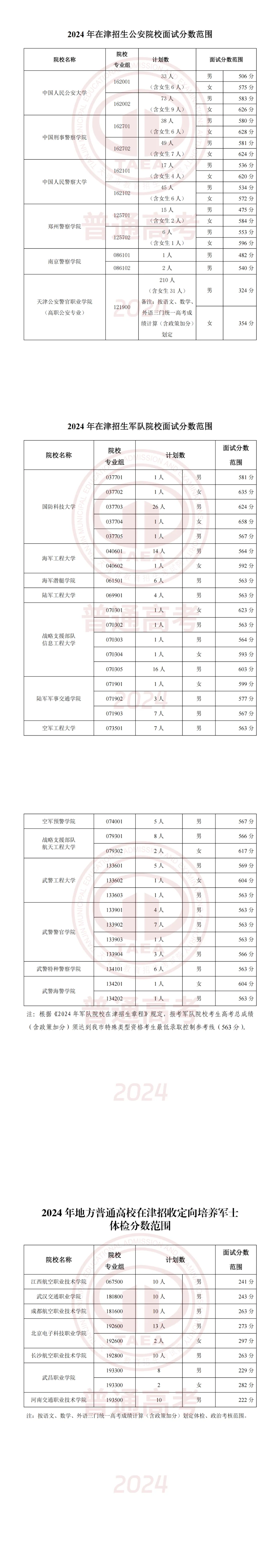 2024年,26所军队院校在江苏省计划招收普通高中毕业生716人。根据报考人数和有关规定,现公布面试和体格检查资格线如下: