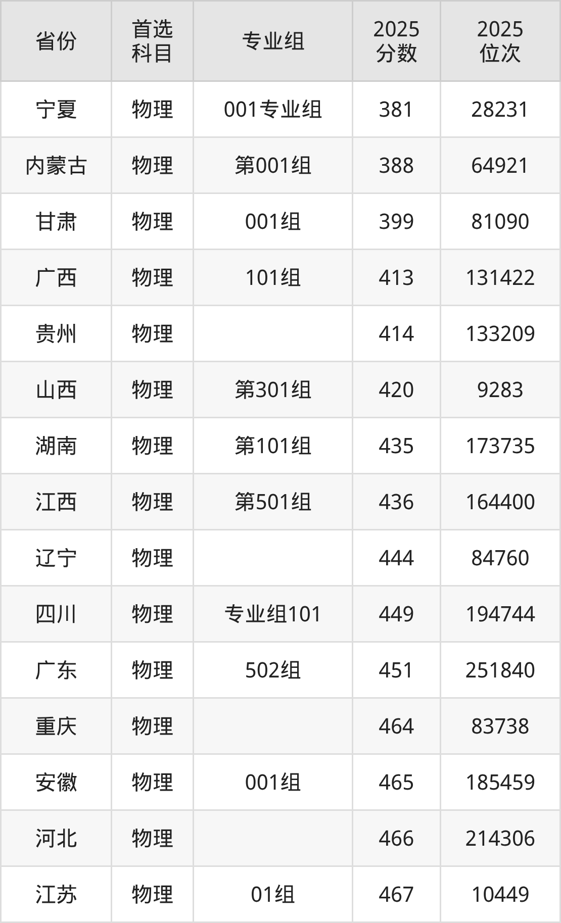 物理类最低分对应地区为宁夏(001专业组),录取位次为28231,超专科线231分;最高分对应地区为江苏(01组),录取位次为10449,超专科线247分。