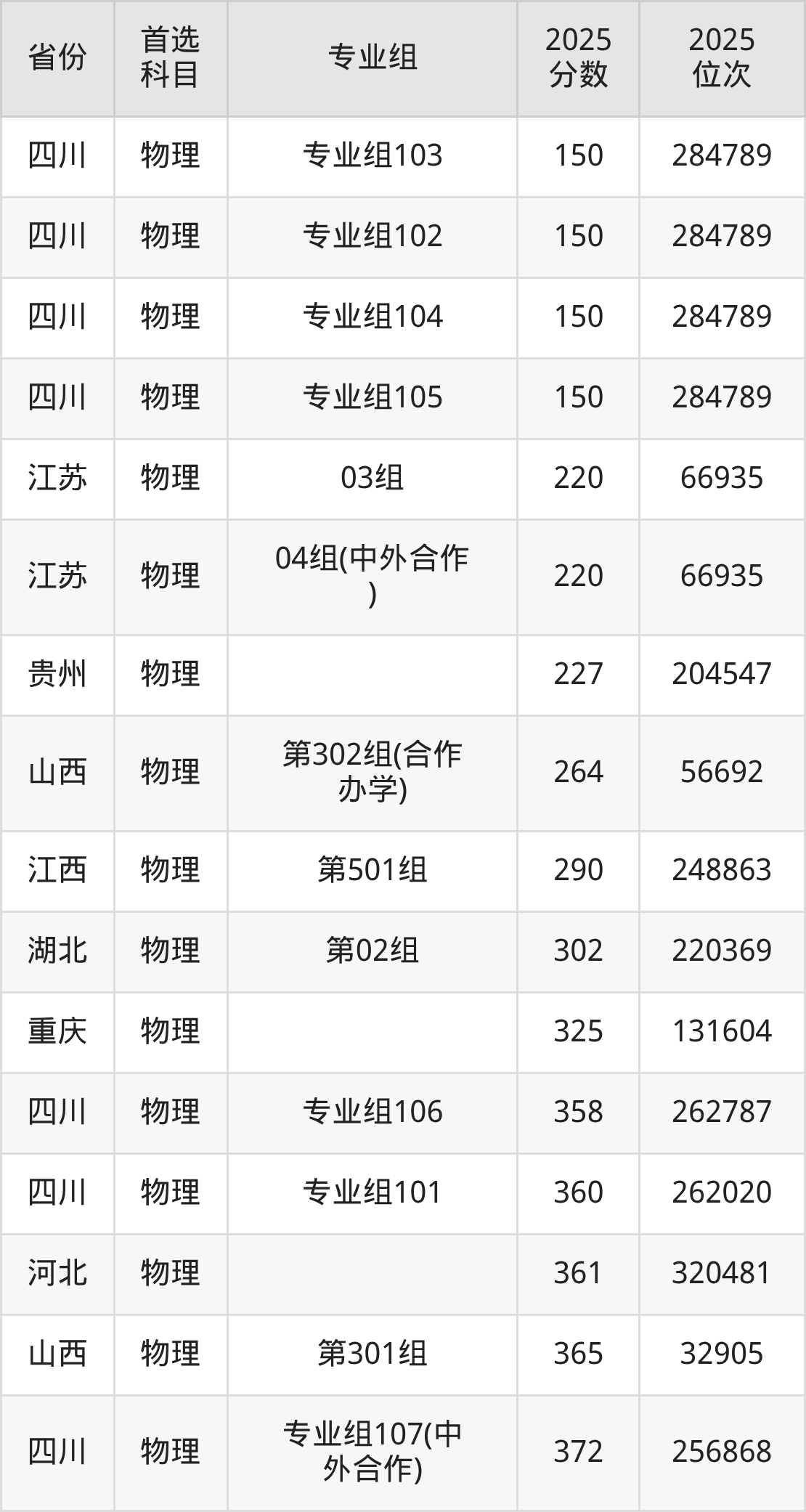 物理类最低分对应地区为四川(专业组103),录取位次为284789;最高分对应地区为四川(专业组107(中外合作)),录取位次为256868,超专科线222分。