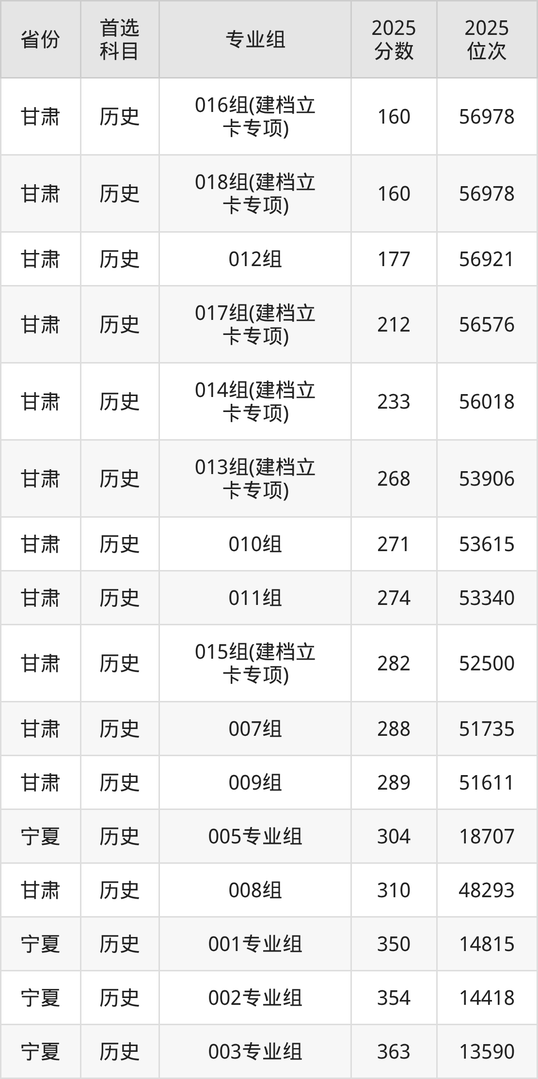 历史类:007组288分、51735名,008组310分、48293名,009组289分、51611名,010组271分、53615名,011组274分、53340名,012组177分、56921名,013组(建档立卡专项)268分、53906名,014组(建档立卡专项)233分、56018名,015组(建档立卡专项)282分、52500名,016组(建档立卡专项)160分、56978名,017组(建档立卡专项)212分、56576名,018组(建档立卡专项)160分、56978名;