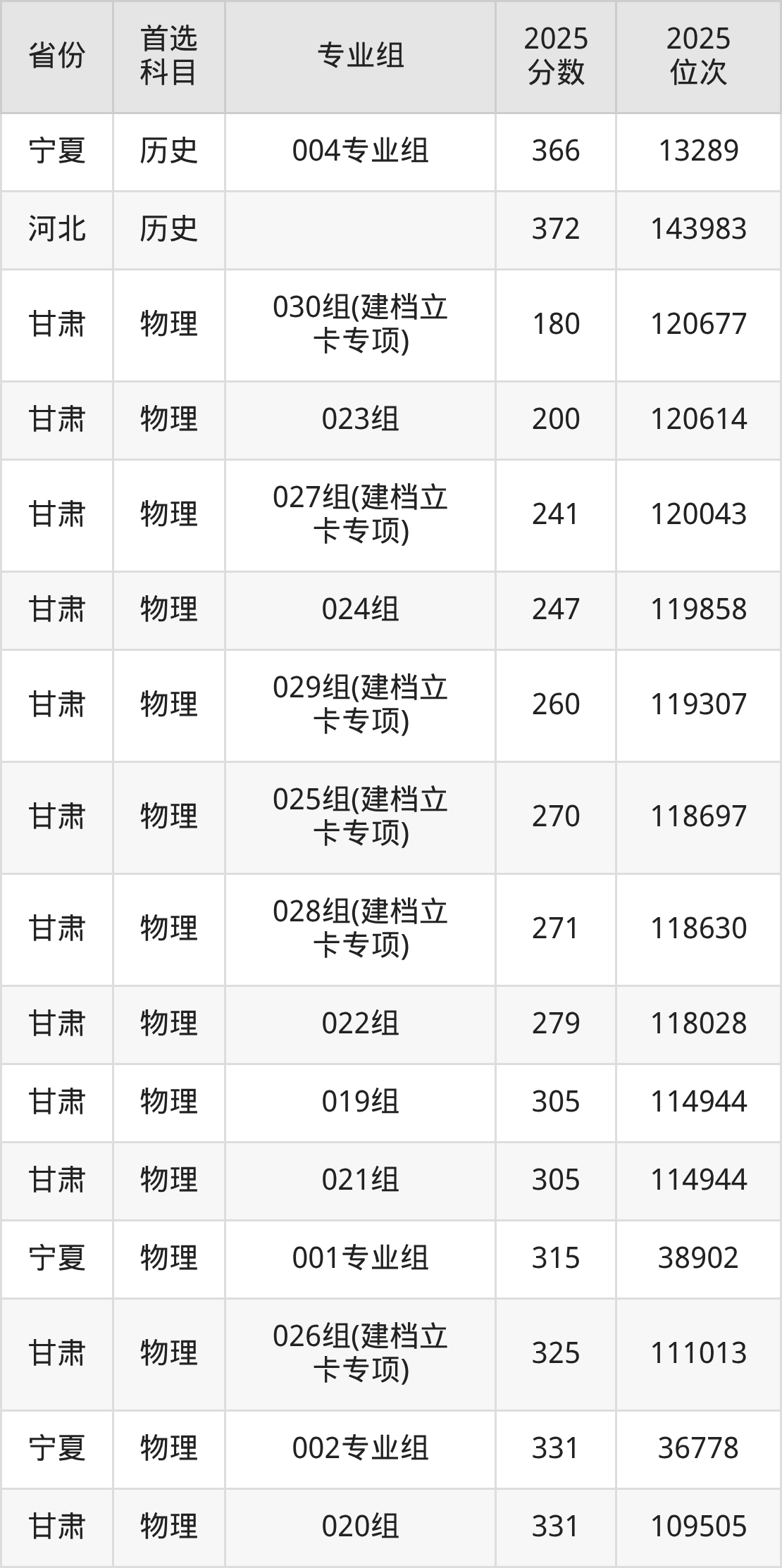 物理类:019组305分、114944名,020组331分、109505名,021组305分、114944名,022组279分、118028名,023组200分、120614名,024组247分、119858名,025组(建档立卡专项)270分、118697名,026组(建档立卡专项)325分、111013名,027组(建档立卡专项)241分、120043名,028组(建档立卡专项)271分、118630名,029组(建档立卡专项)260分、119307名,030组(建档立卡专项)180分、120677名;