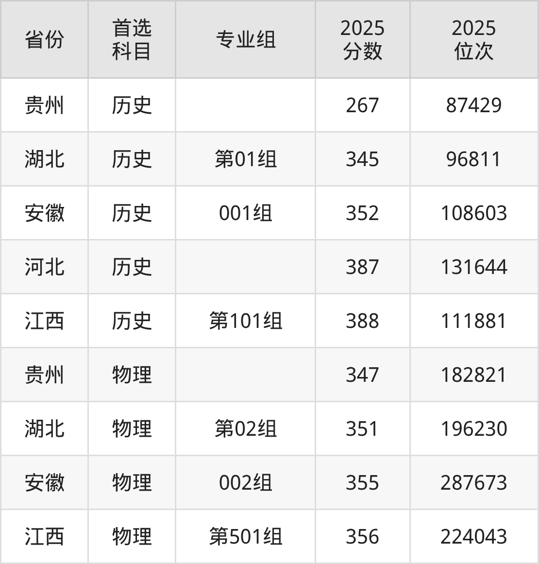 历史类最低分对应地区为贵州,录取位次为87429,超专科线87分;最高分对应地区为江西(第101组),录取位次为111881,超专科线98分。
