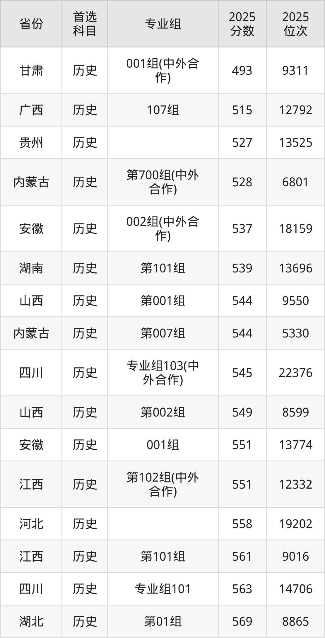 历史类最低分对应地区为甘肃(001组(中外合作)),录取位次为9311,超本科线81分;最高分对应地区为四川(专业组102),录取位次为9693,超本科B111分。