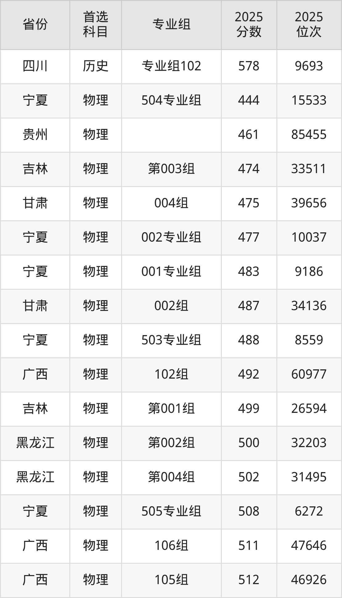 物理类最低分对应地区为宁夏(504专业组),录取位次为15533,超本科B72分;最高分对应地区为江苏(05组),录取位次为37720,超本科线134分。