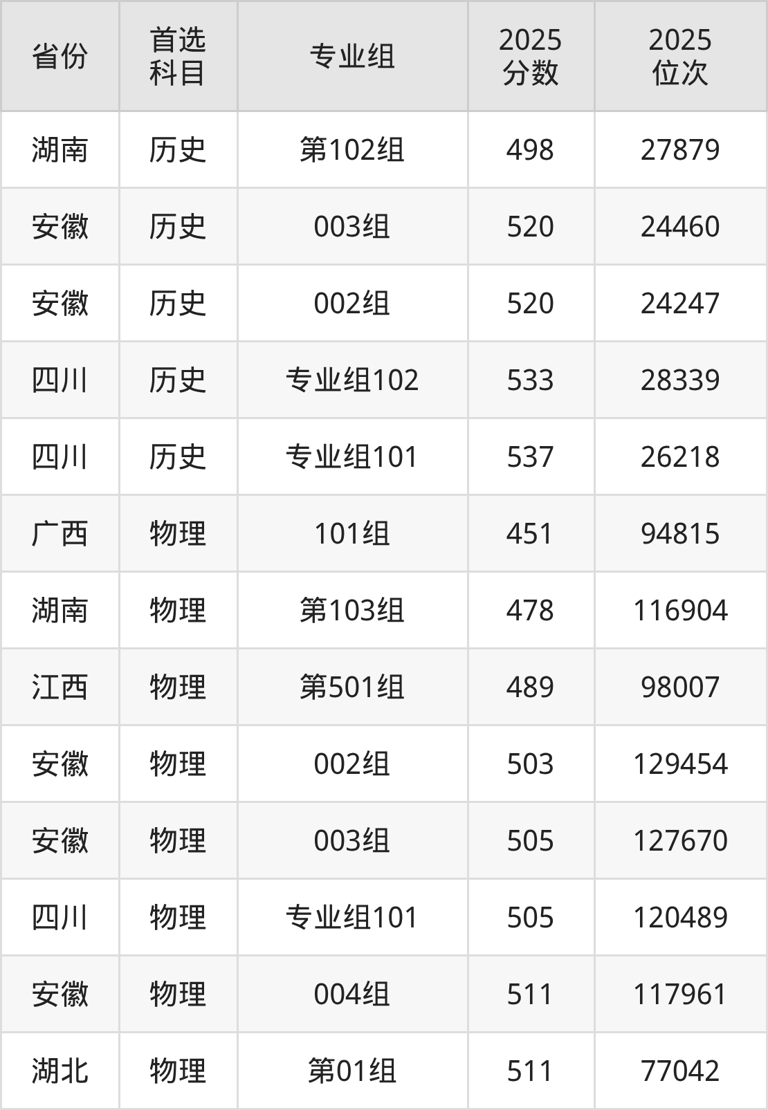 历史类最低分对应地区为湖南(第102组),录取位次为27879,超本科线52分;最高分对应地区为四川(专业组101),录取位次为26218。