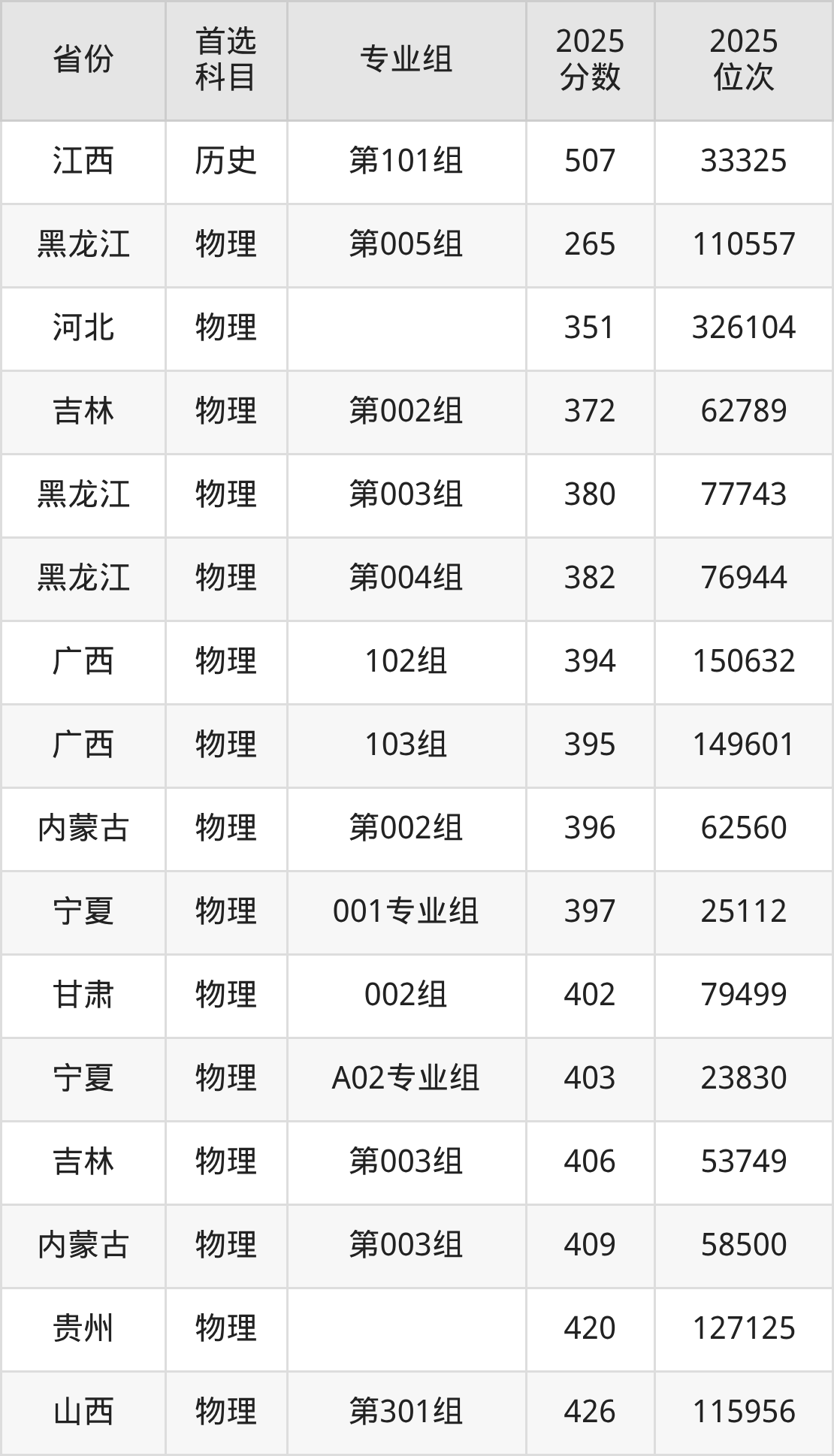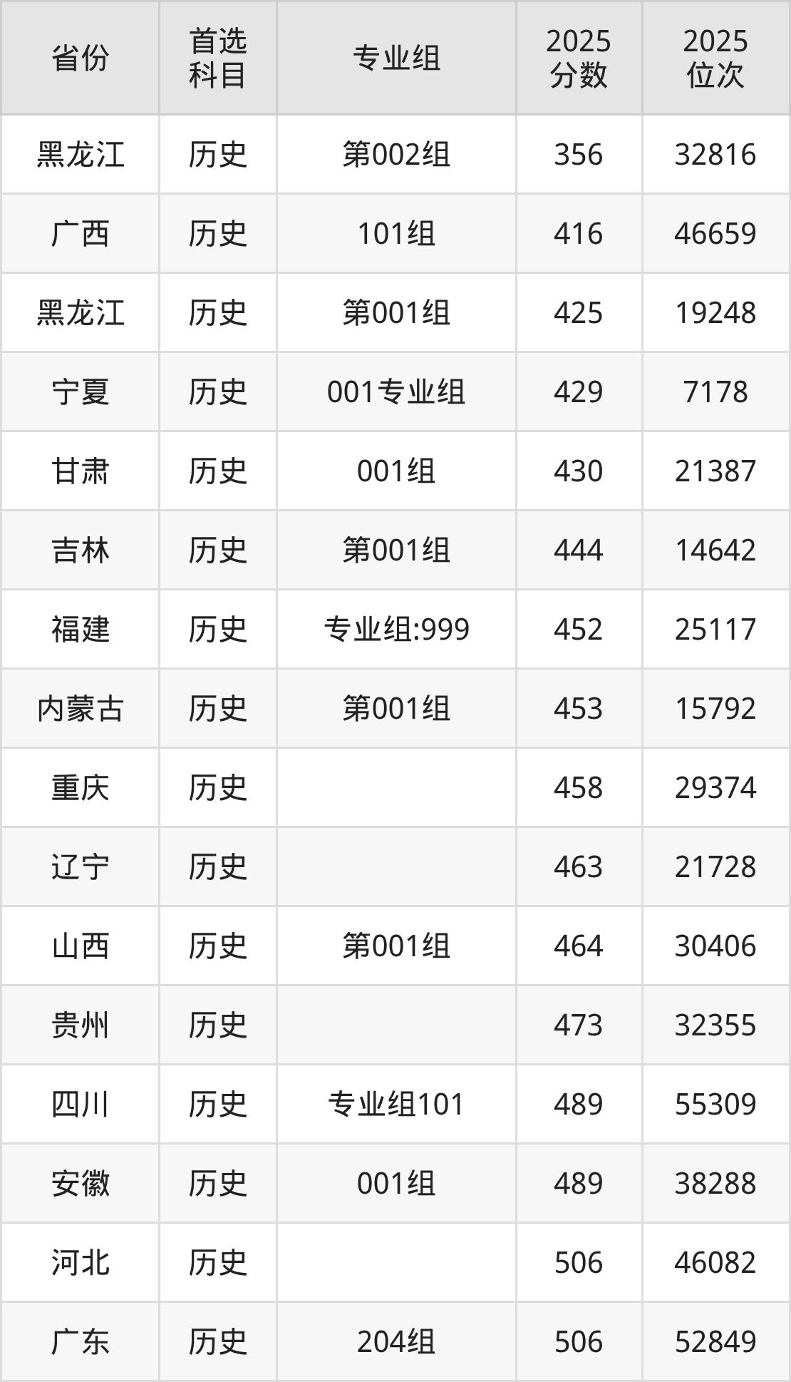 历史类最低分对应地区为黑龙江(第002组),录取位次为32816,超专科线196分;最高分对应地区为江西(第101组),录取位次为33325,超本科线21分。