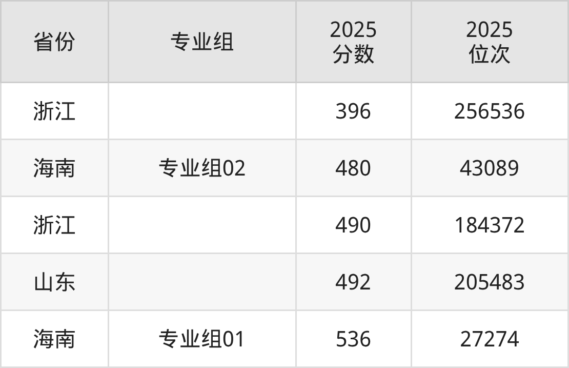 最低分对应地区为浙江,录取位次为256536,超二段线128分;最高分对应地区为海南(专业组01),录取位次为27274,超本科线56分。
