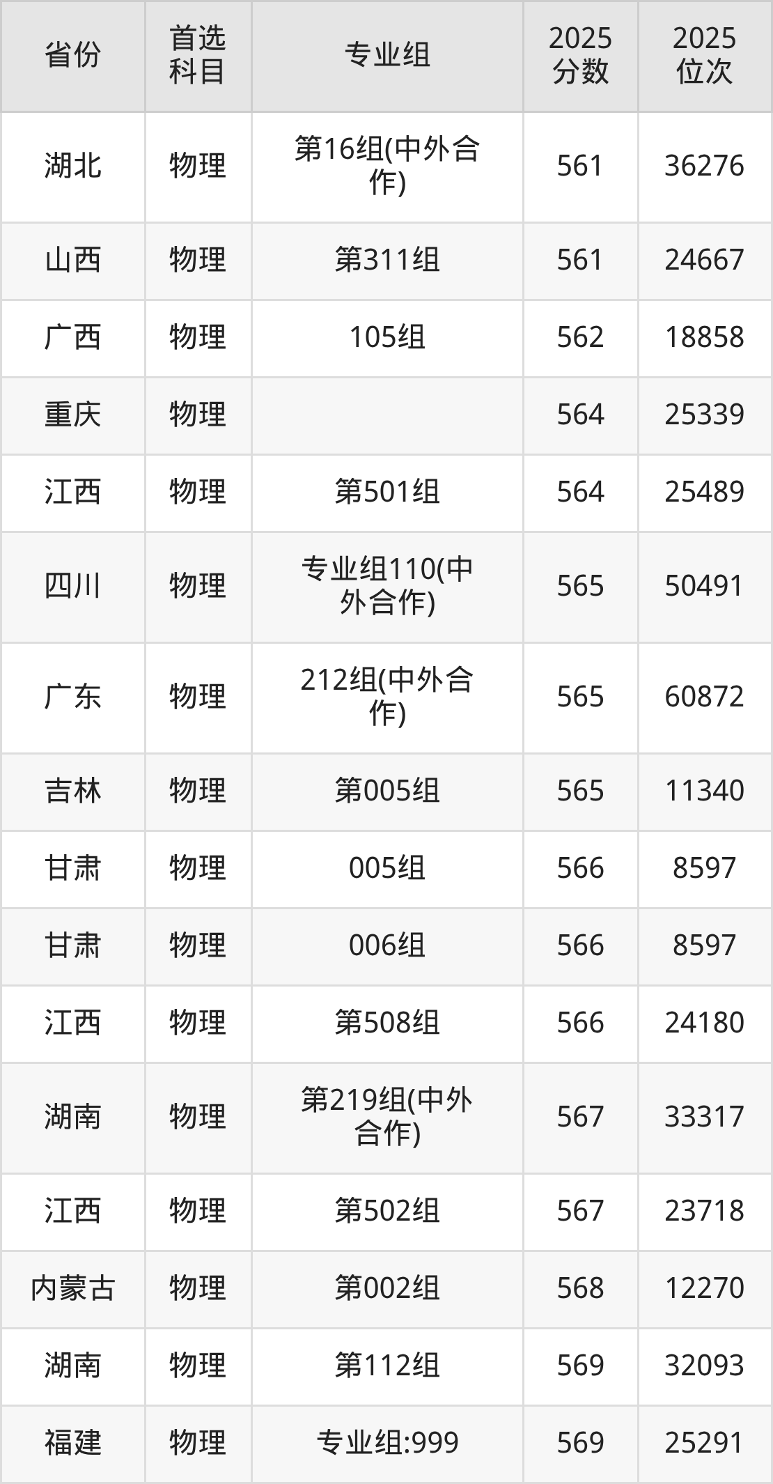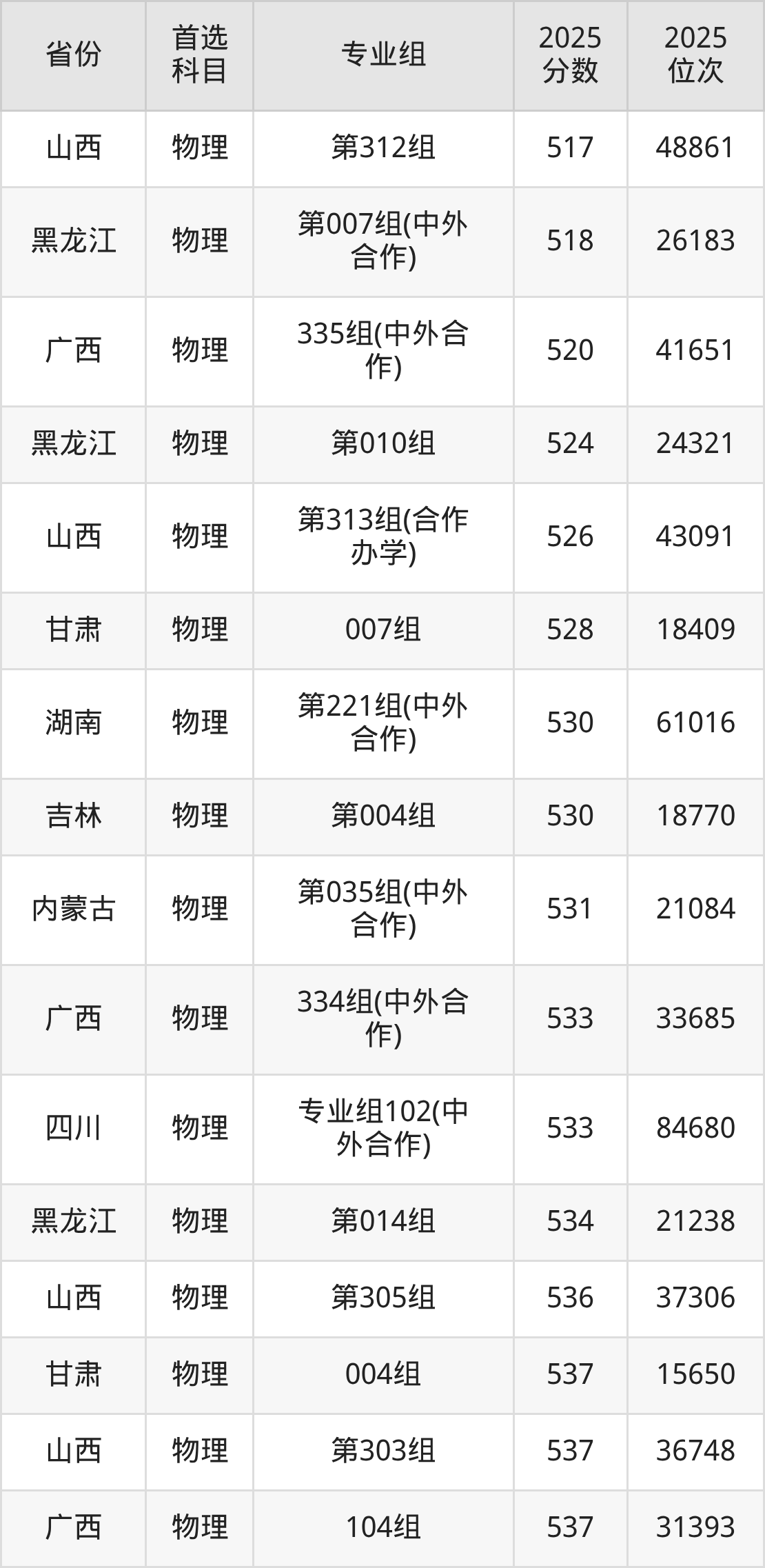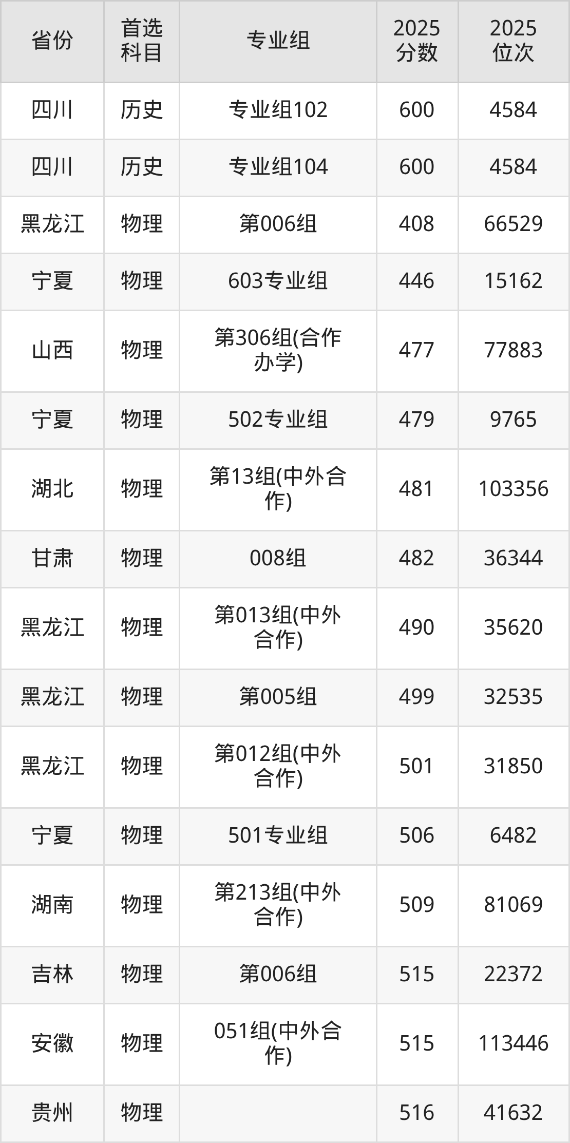 物理类最低分对应地区为黑龙江(第006组),录取位次为66529,超本科线48分;最高分对应地区为四川(专业组108),录取位次为16212,超本科B175分。