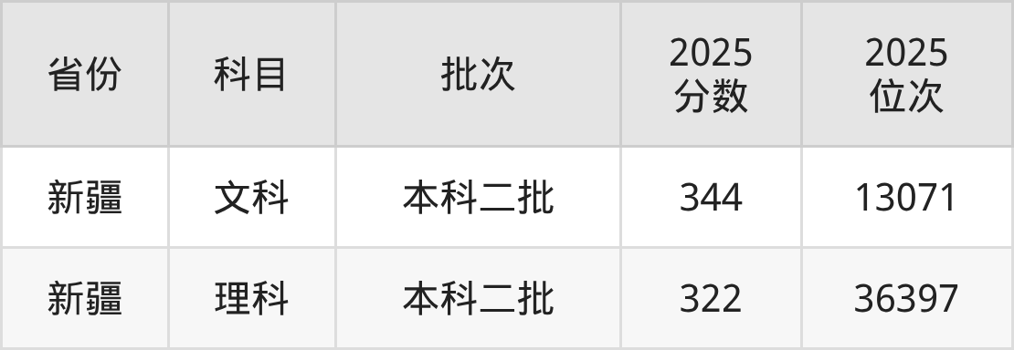 文科最低分对应地区为新疆,录取位次为13071,超二本线14分。