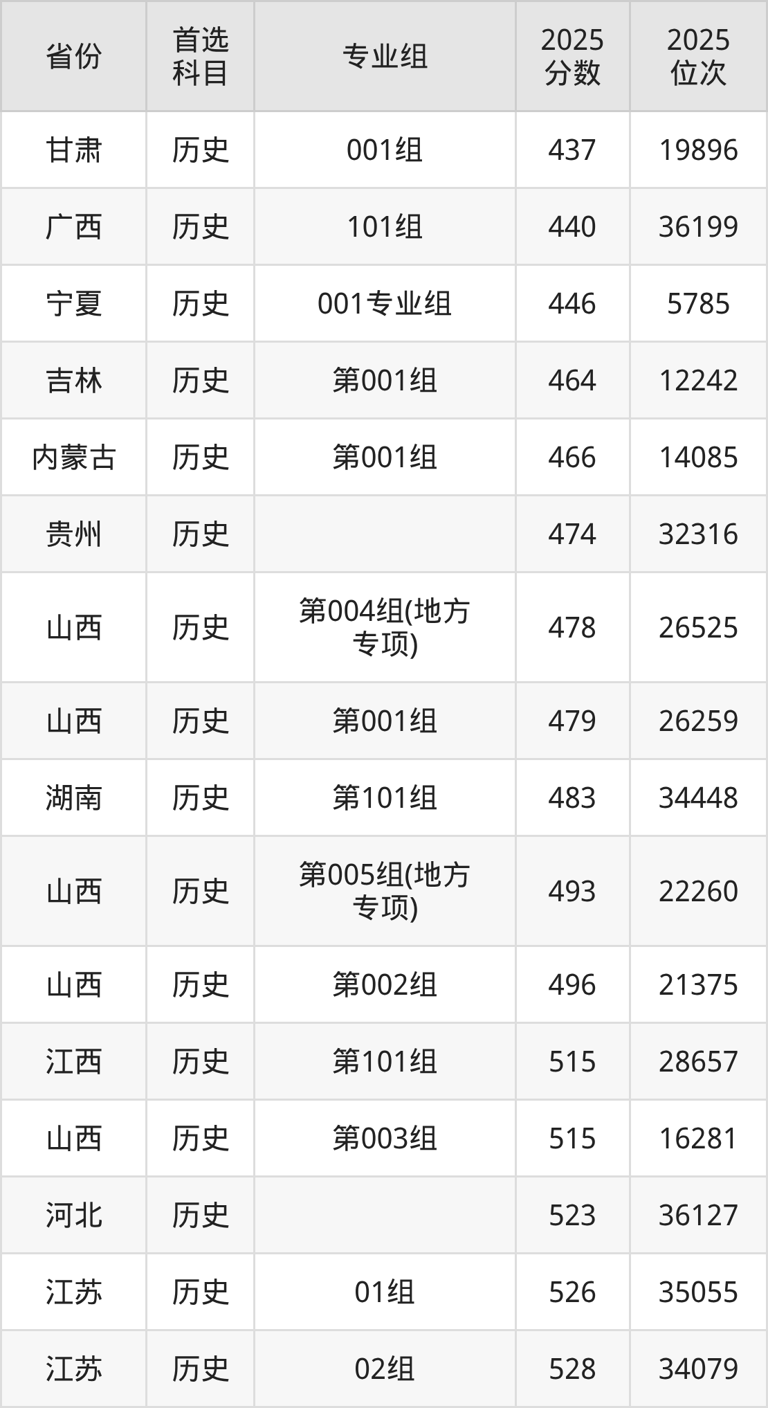 历史类:第001组479分、26259名,第002组496分、21375名,第003组515分、16281名,第004组(地方专项)478分、26525名,第005组(地方专项)493分、22260名;