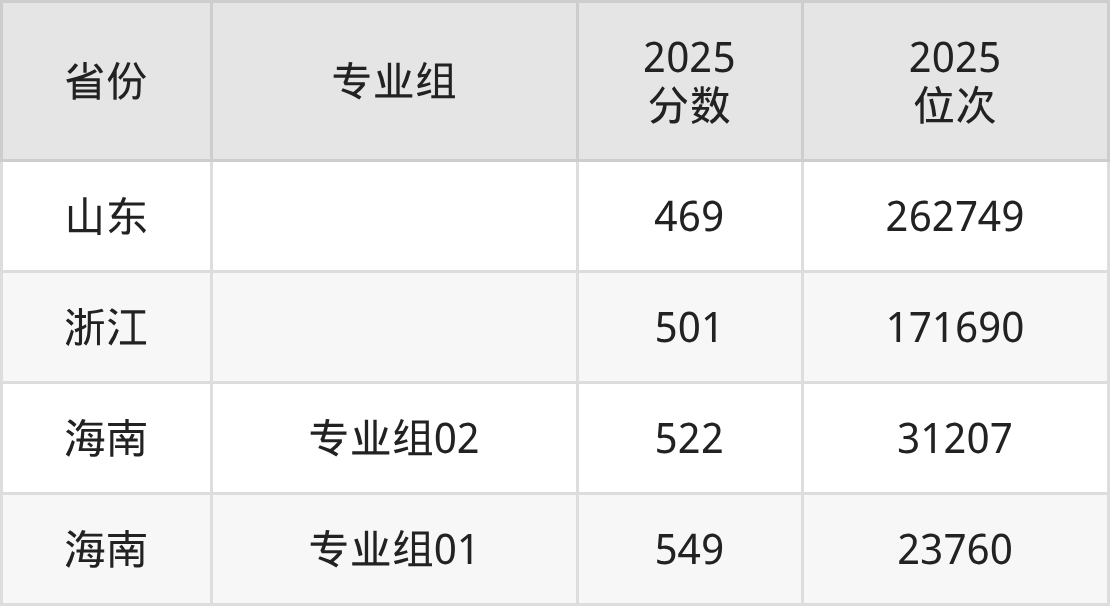 最低分对应地区为山东,录取位次为262749;最高分对应地区为海南(专业组01),录取位次为23760,超本科线69分。