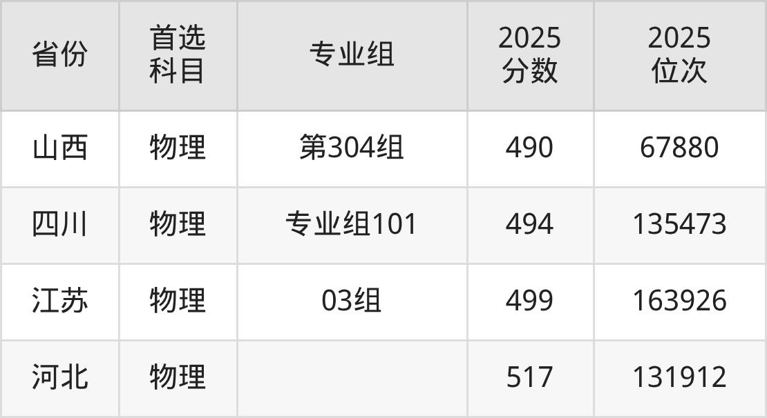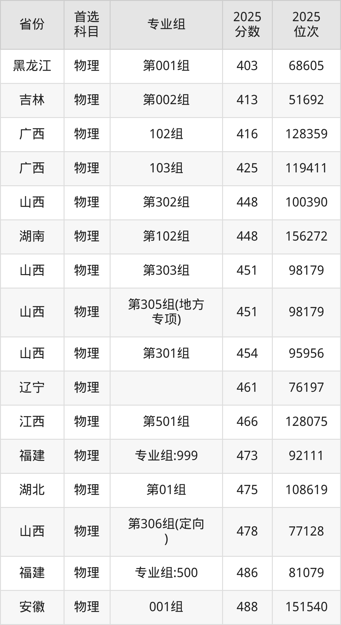 物理类:第301组454分、95956名,第302组448分、100390名,第303组451分、98179名,第304组490分、67880名,第305组(地方专项)451分、98179名,第306组(定向)478分、77128名;