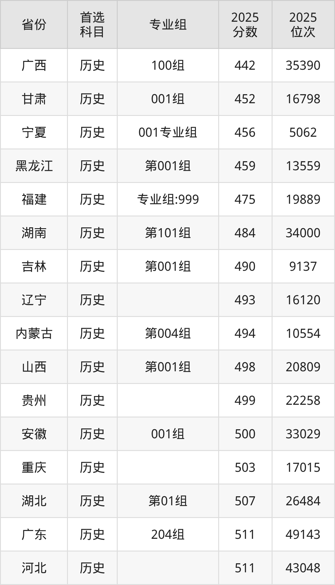 历史类最低分对应地区为广西(100组),录取位次为35390;最高分对应地区为四川(专业组101),录取位次为26727,超本科B69分。