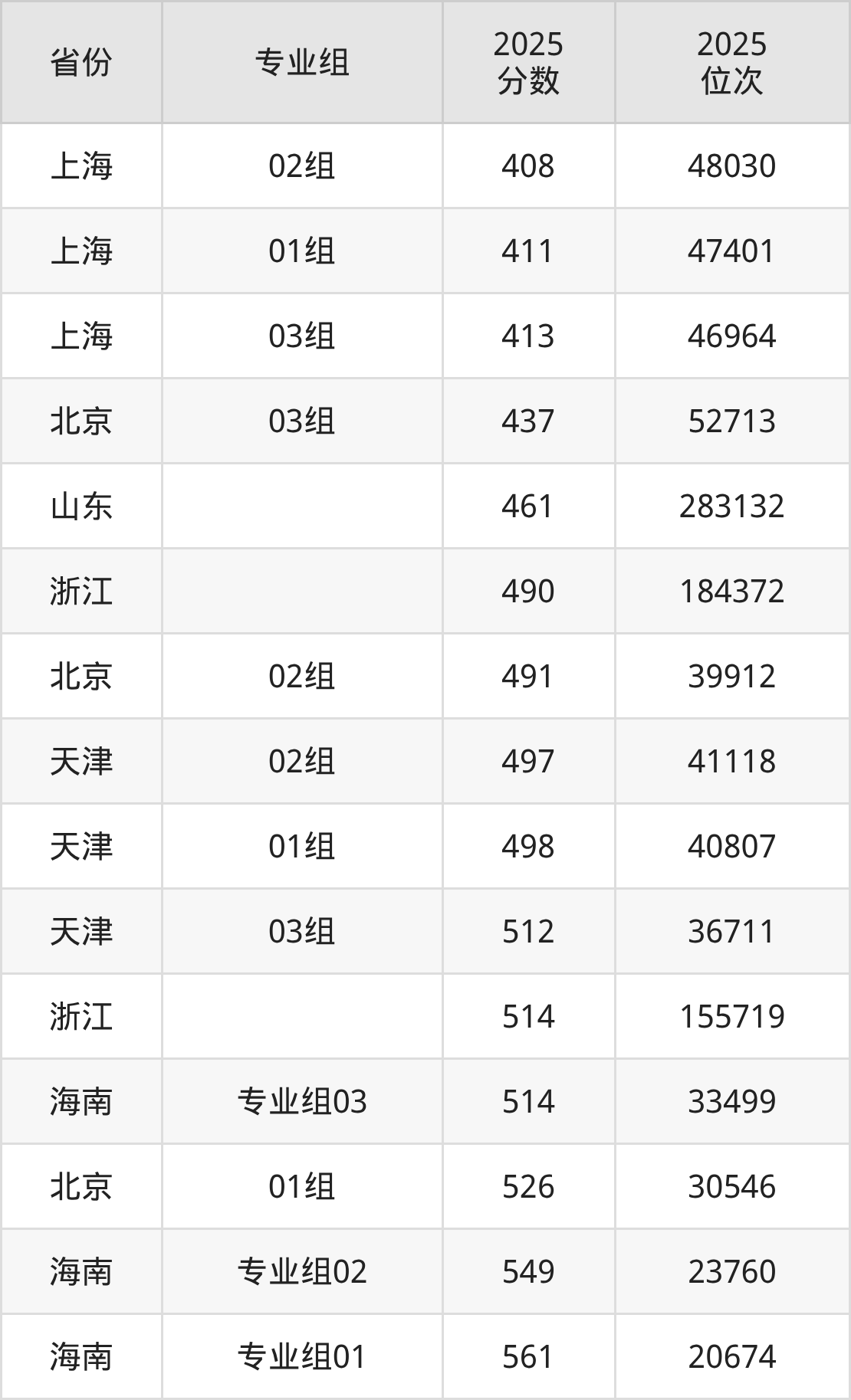 最低分对应地区为上海(02组),录取位次为48030,超本科线6分;最高分对应地区为海南(专业组01),录取位次为20674,超本科线81分。