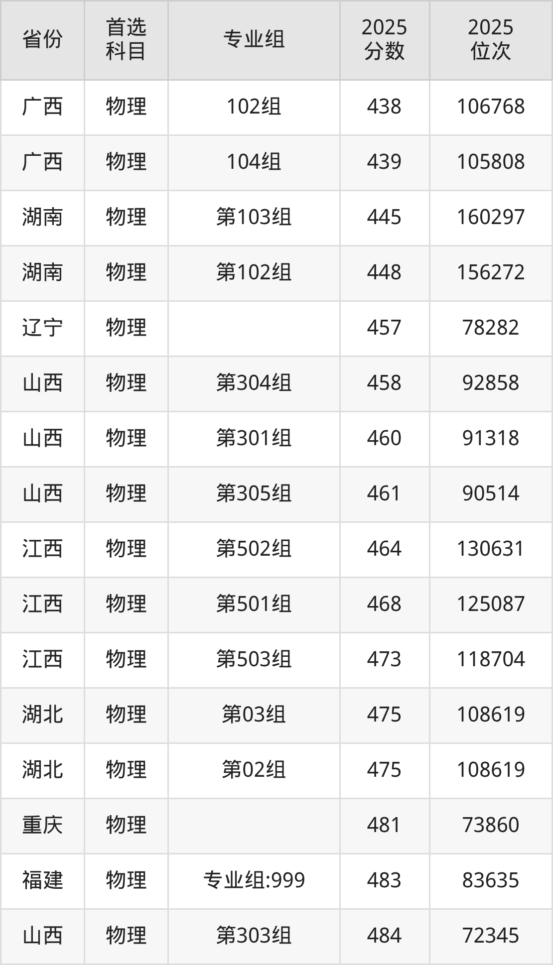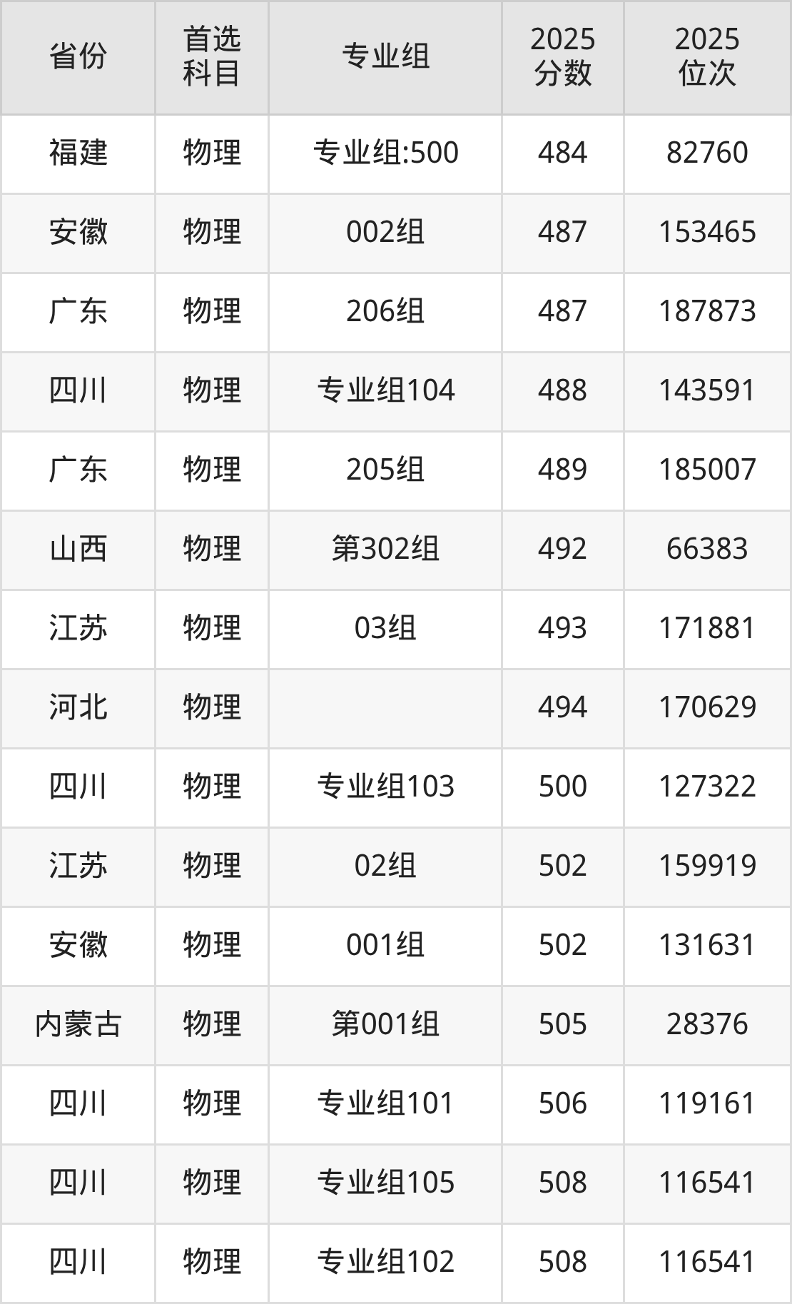 物理类最低分对应地区为黑龙江(第003组),录取位次为69792;最高分对应地区为四川(专业组102),录取位次为116541。