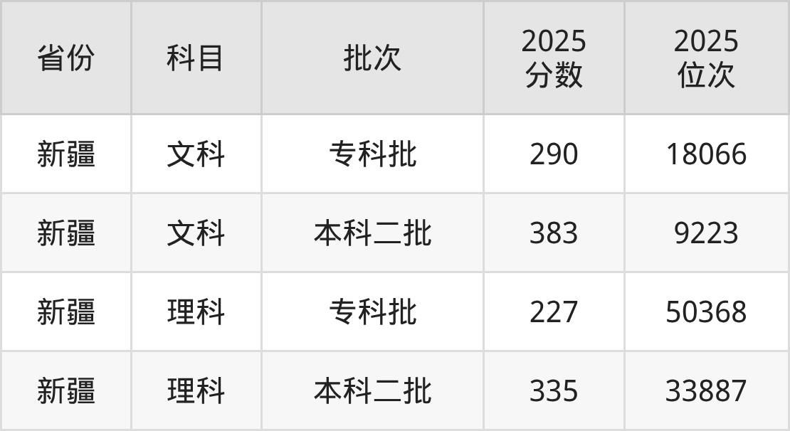 文科最低分对应地区为新疆,录取位次为18066;最高分对应地区为新疆,录取位次为9223,超二本线53分。