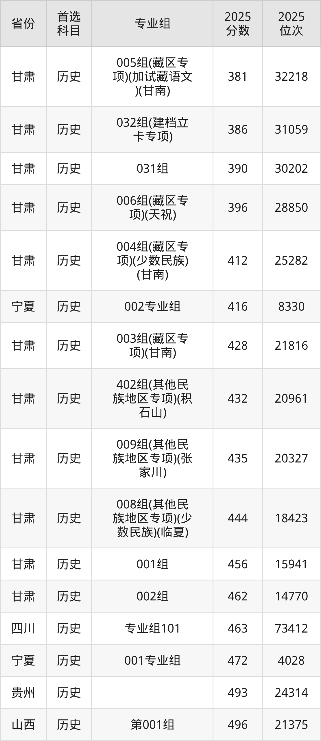 历史类:001组456分、15941名,002组462分、14770名,003组(藏区专项)(甘南)428分、21816名,004组(藏区专项)(少数民族)(甘南)412分、25282名,005组(藏区专项)(加试藏语文)(甘南)381分、32218名,006组(藏区专项)(天祝)396分、28850名,008组(其他民族地区专项)(少数民族)(临夏)444分、18423名,009组(其他民族地区专项)(张家川)435分、20327名,031组390分、30202名,032组(建档立卡专项)386分、31059名,402组(其他民族地区专项)(积石山)432分、20961名;