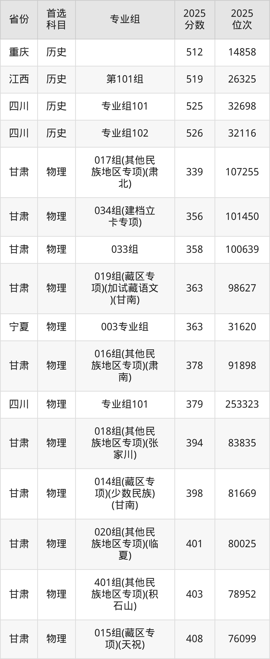 历史类最低分对应地区为甘肃(005组(藏区专项)(加试藏语文)(甘南)),录取位次为32218,低本科线31分;最高分对应地区为四川(专业组102),录取位次为32116,超本科B59分。