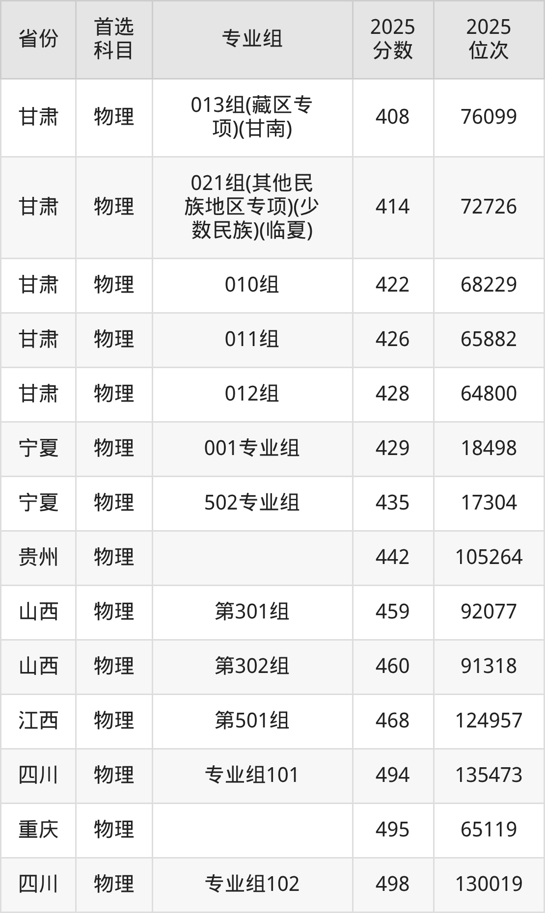 物理类最低分对应地区为甘肃(017组(其他民族地区专项)(肃北)),录取位次为107255,低本科线35分;最高分对应地区为四川(专业组102),录取位次为130019。