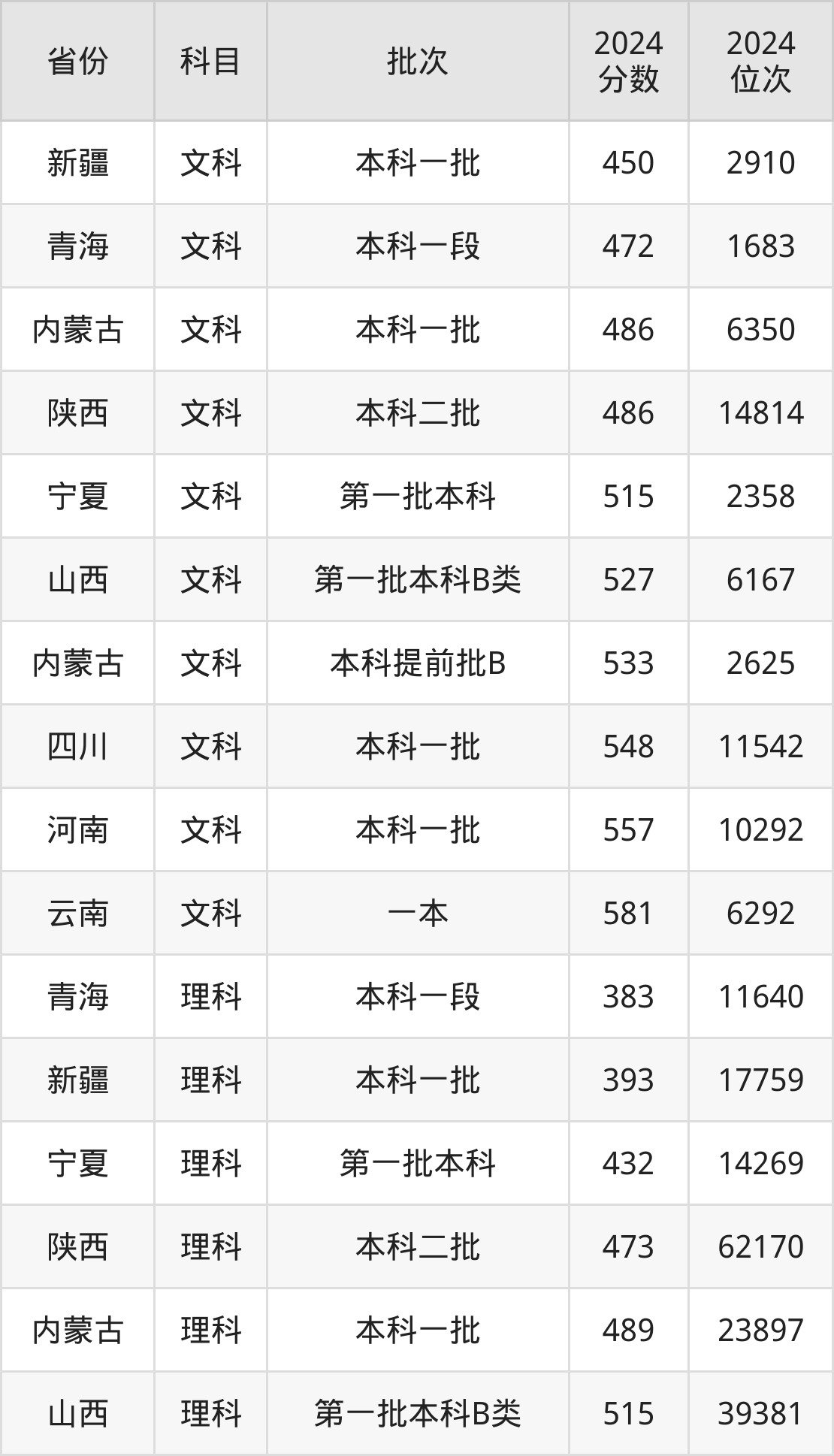 文科最低分对应地区为新疆,录取位次为2910,超一本线25分;最高分对应地区为云南,录取位次为6292,超一本线31分。